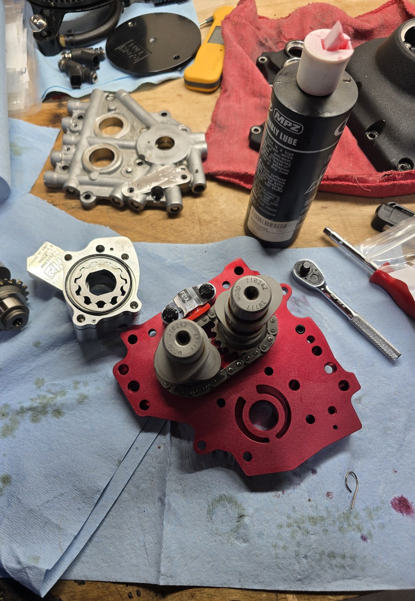A little more progress over the weekend. Got the Feuling pump installed to the cam plate and the cam plate in the bike. I gotta tell you, the tolerances on that oil plate are tight AF, it took a lot of patients and gentle finagling to get it in place. Also installed the HD proximity fob system that my wife got me for Christmas, I'm really looking forward to having that.