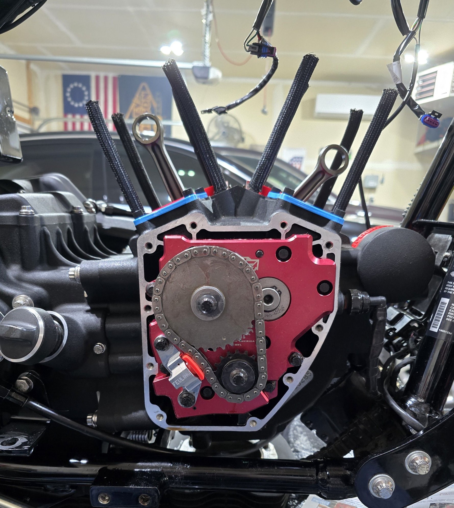Got the cam chest completely buttoned up, so the bottom end is done. I was waiting a Feuling video, and they showed the slop in the stock crank sprocket and said it could contribute up to 5 degrees of cam timing. When I was putting mine back together, I noticed that they weren't lying so for all the money I'm spending I figured a few extra bucks wasn't going to hurt. Ordered the new Feuling crank sprocket from Dennis Kirk and threw that in at the same time. Just like the Feuling cam plate, the tolerance on this sprocket is crazy tight, definitely a press fit. It sucked getting it on to check cam sprocket spacing then getting it back off for final install, but I'm very happy with the result.