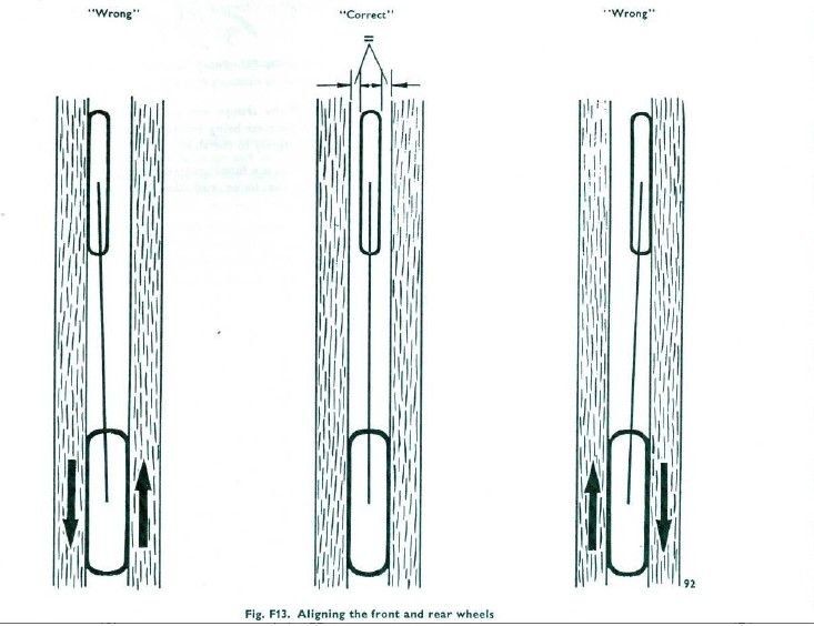 I have seen this drawing and the last time I tried to align the bike, I used, (to hold the front wheel in alignment), not a string as Max suggested now, but two straight pieces of wood locked to be parallel.