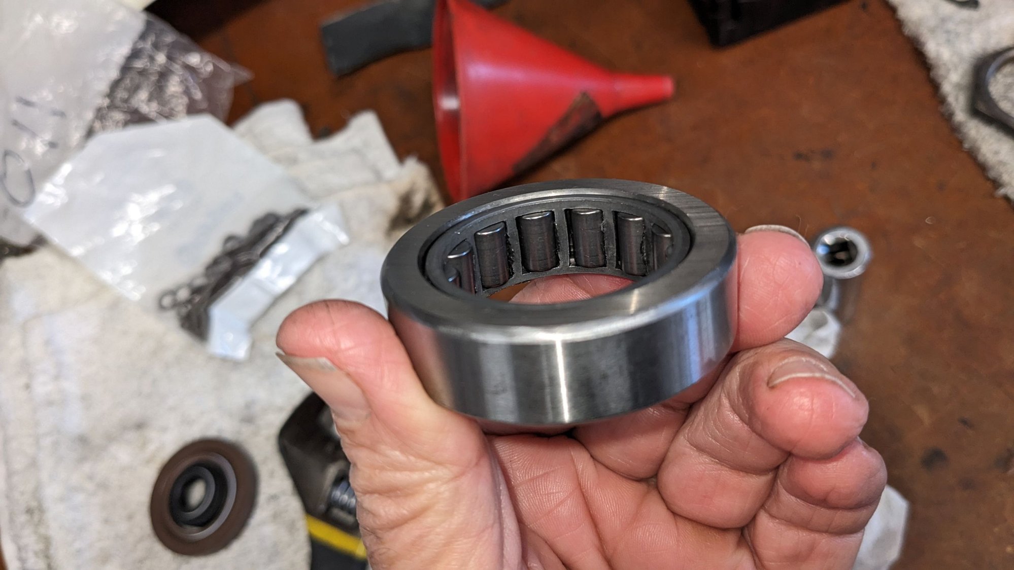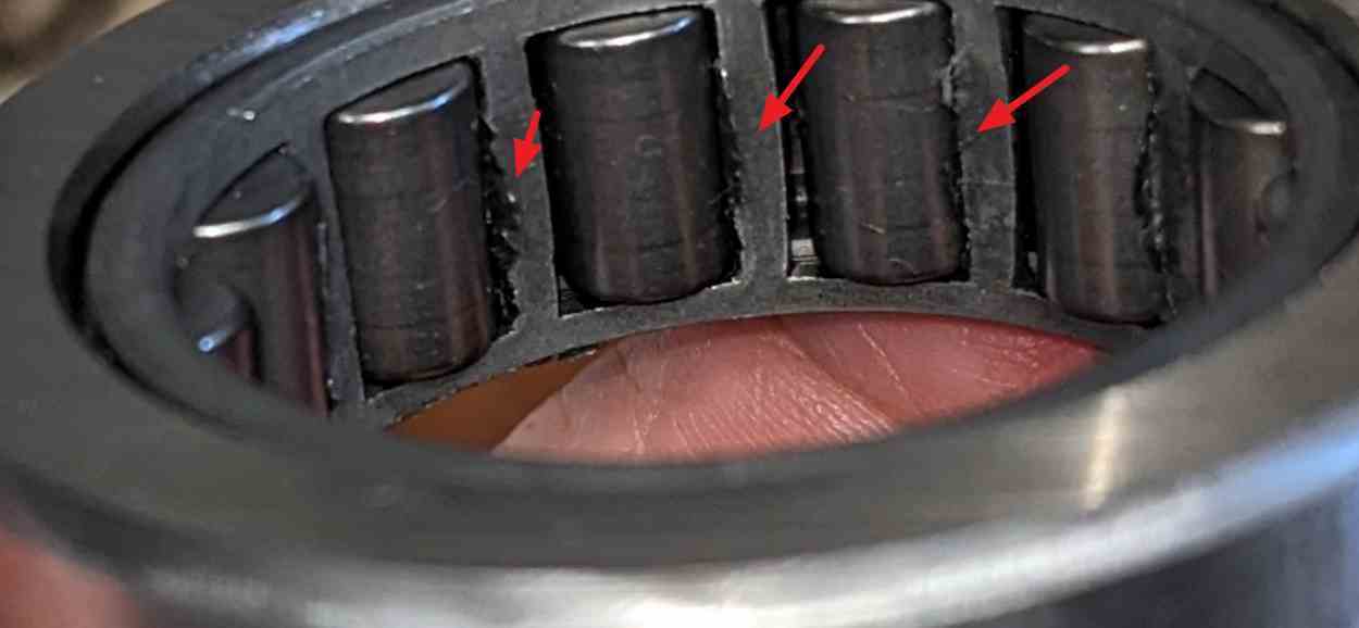 Notice that the bearing cage burrs that stick out, I wonder if this was caused by the race being distorted and causing the rollers to be forced up against the cage..