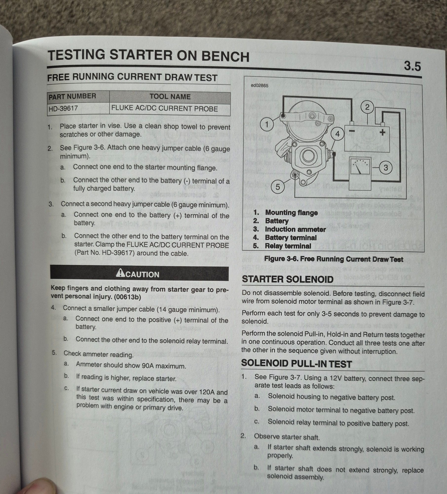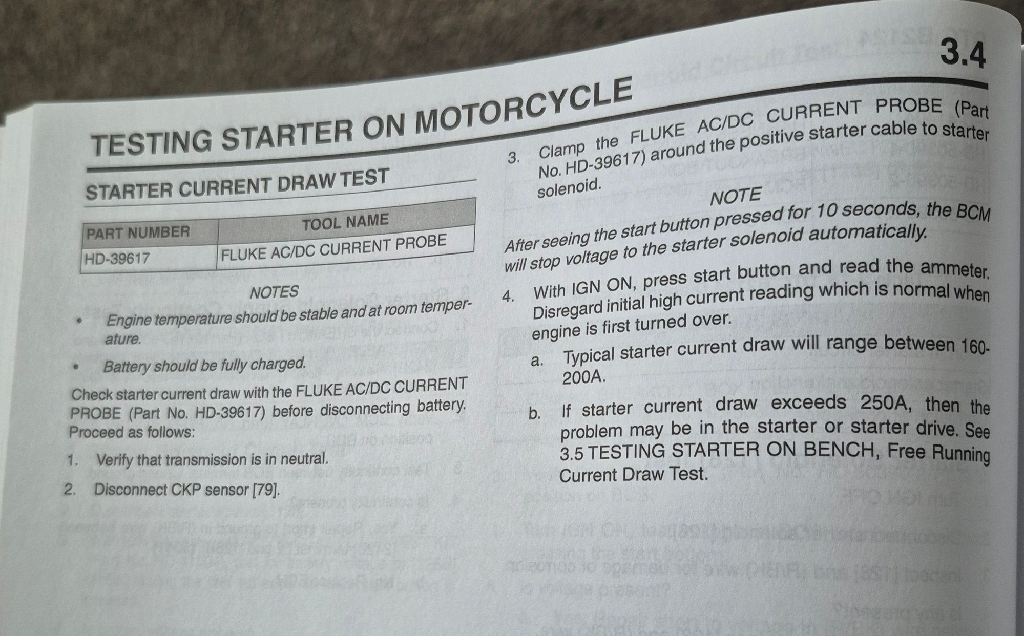 I just got my new to me 2013 electric diagnostic manual and I will post up pictures of doing a current draw test on the bike or on the bench. Any clamp on amp meter will give you the information you need to do the tests.