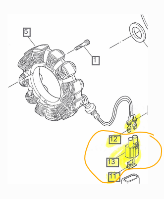 Anyone know where besides Harley to get the 2 pin waterproof stator plug-in that goes on the stator side, my new Stator did not come with it and my old one burned off. Harley wants $50 for the plastic housing (#13) and another $17.00 for the piece that holds it together (#11) Geez Louise, come on Harley, ya already make your money on the bikes, at least ya can give us a break on 2 small plastic pieces, come on. I see no where that has this plug seperate but HD i see why my friend has the saying "F**K the Factory" for HD prices are way too high for stuff