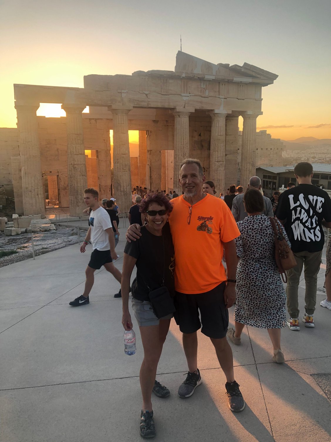 With my wife on vacation. First Sturgis shirt at the Acropolis?