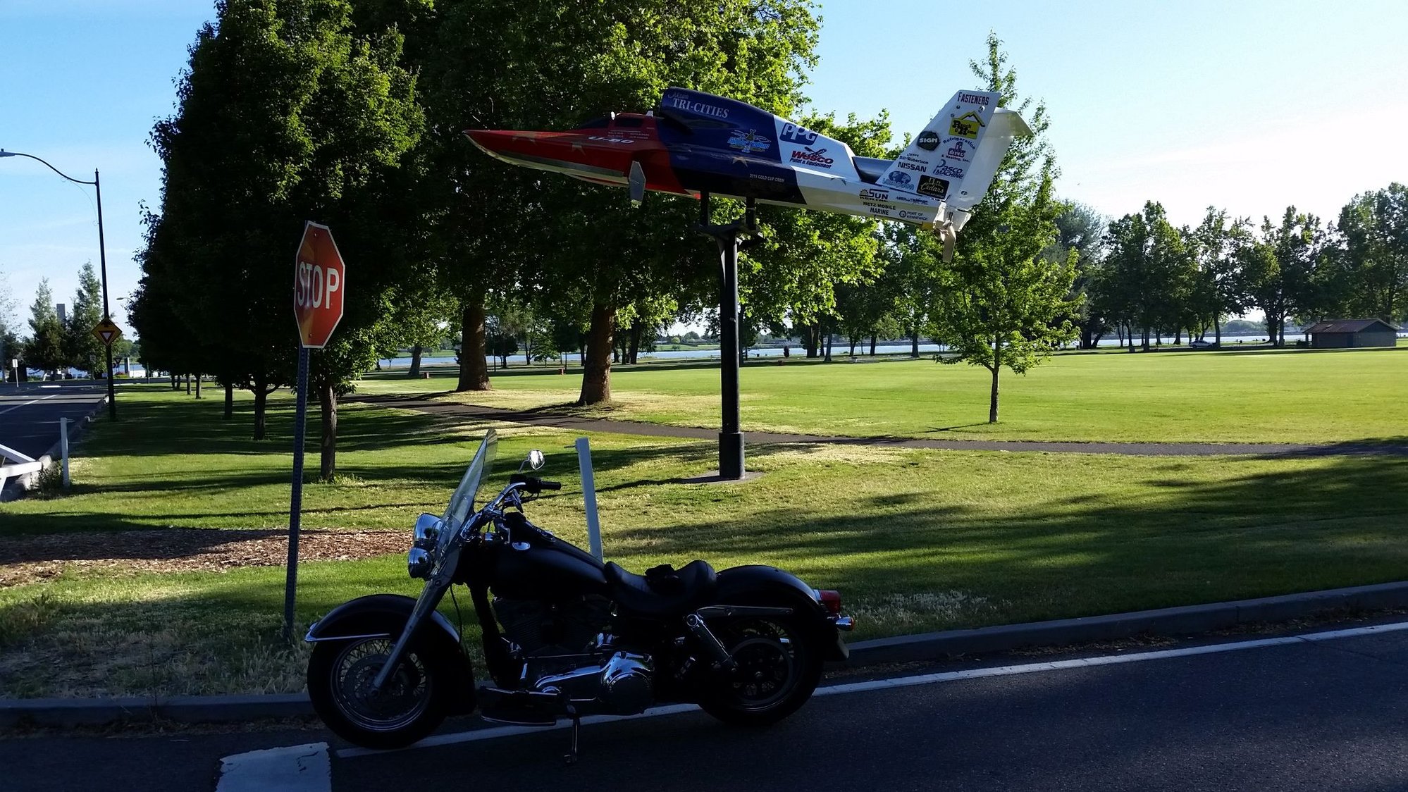 Not sure if it's still there but we had a hydroplane on a post, guess I'd better take a look! Used to have a VW bug camper on a sign at a local RV dealer but it's long gone.