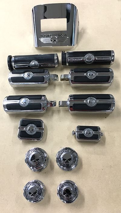 I recently bought my 2009 Super Glide Custom and it had a lot of Skull accessories which I don't like and am replacing with another type. The items are in pretty good shape with minor pitting in spots but nothing noticeable when on the bike.