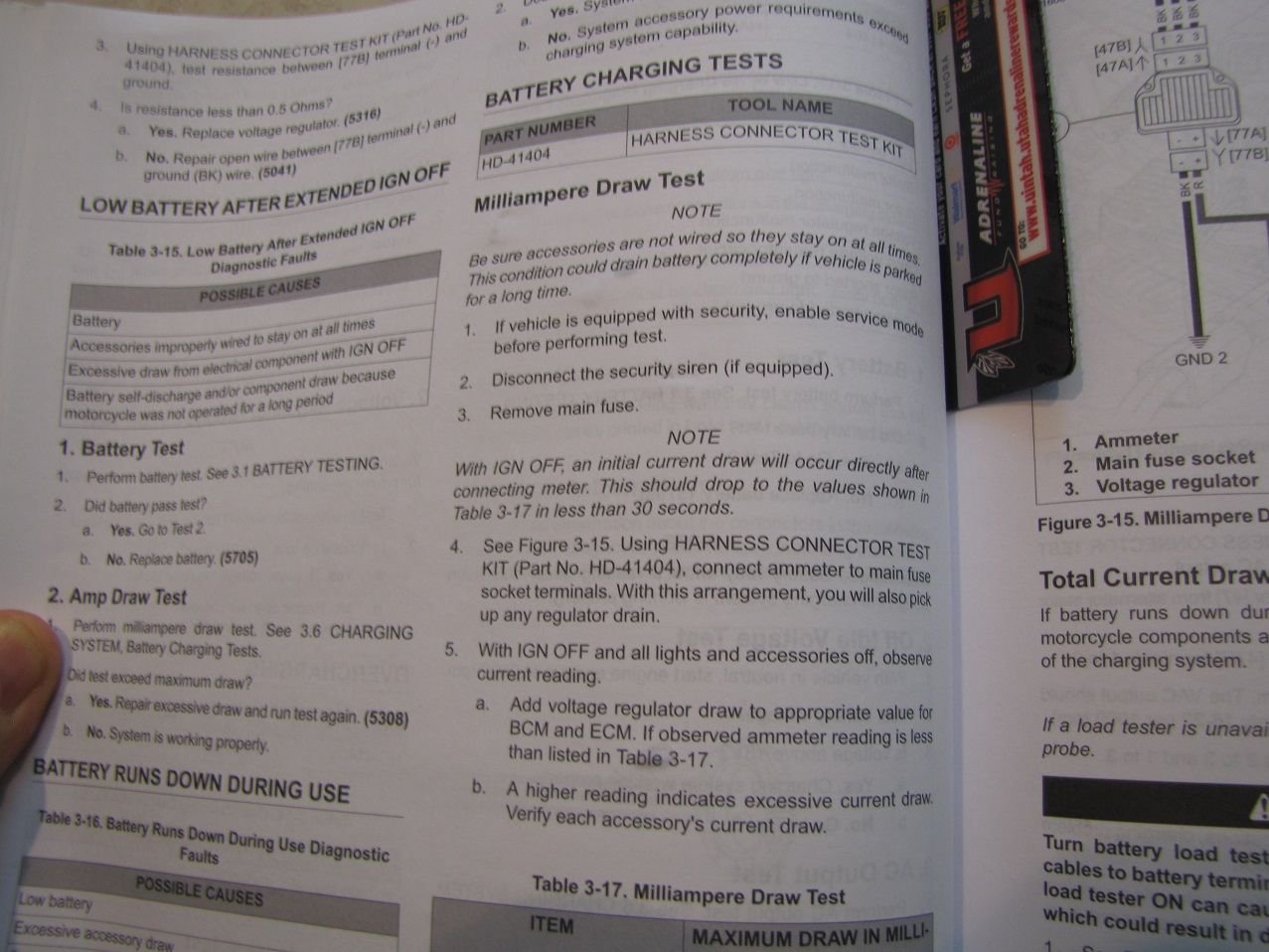 Thanks Vernal. I have tested the voltage upon starting bike with charged battery and it drops to 8.8 volts. Yet the battery tested good at the Harley dealer. Even though the stock Harley battery says it has 405 CCA, it only tested at 366 CCA at 12.4 volts. But maybe that's normal for a 1 yr and 9 month old battery? I also think the battery load tester the dealer uses will state the battery is OK if it tests over 50%. Here is a link to the HD battery tester the dealer uses. It's on page 3.