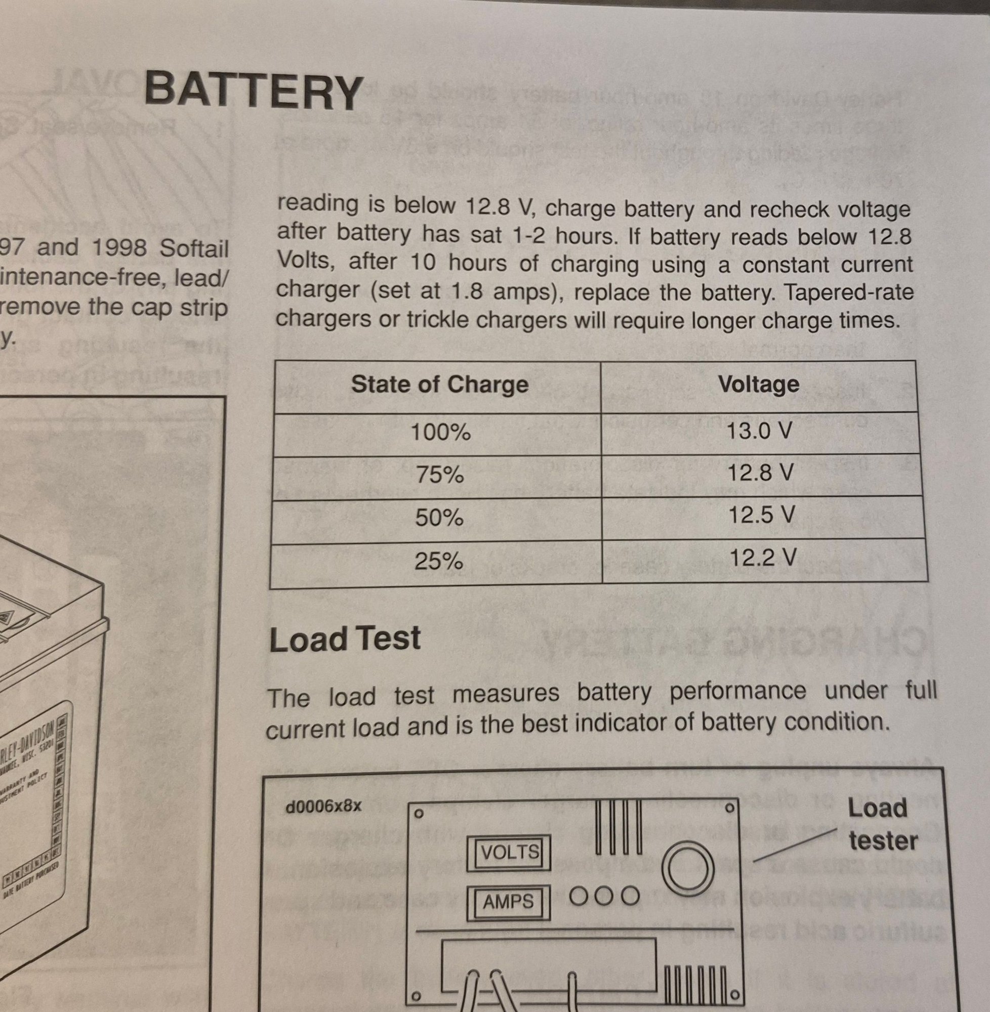 I believe by installing a high output system on a bike that does not have the demand, you are actually over charging the battery shortening the life of the battery.. The following excerpts are out of my 98 Softail FSM and my 2013 Dyna FSM.. Take a look at the difference in standing voltage readings that determine the state of the battery.. Why the difference?? Has the MOCO determined that bigger/more is not better?? Or is it because the type of battery?? One being a sealed lead/calcium sulfuric acid and the other a sealed AGM lead/calcium sulfuric acid, hmmmm, or is there a difference and if not why the different ratings?? Regardless of the 2 different designs the recommended charging method has changed.. Why??