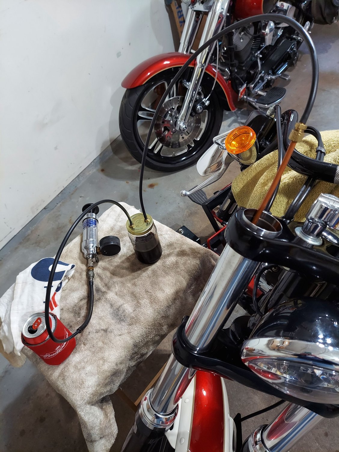 Seeing that I don't have drains on my fork lowers and all time doing is changing out the Springs, going to Progressives, I'm just gonna suck it out with a mighty vac get all I can and measure what I take out and go from there... I really didn't feel like taking the whole thing apart Just to do new Springs in oil change. Anyone know how many ounces in a 49 mm 2013 FXDB? Thanks..