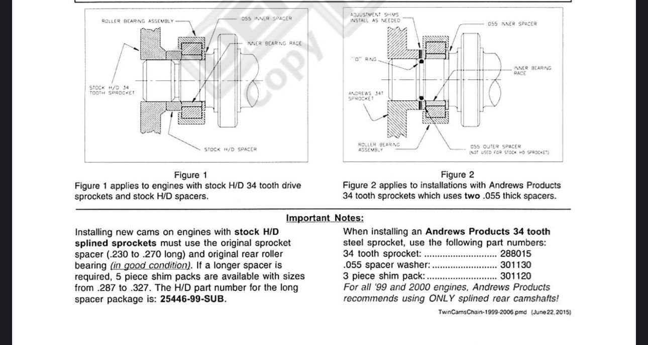 Here it Is. Exactly what I am dealing with (1999 with Andrews cams and sprocket and now a “upgraded” rear roller bearing). Need that .055 spacer for the outside of the bearing and then all should be well.