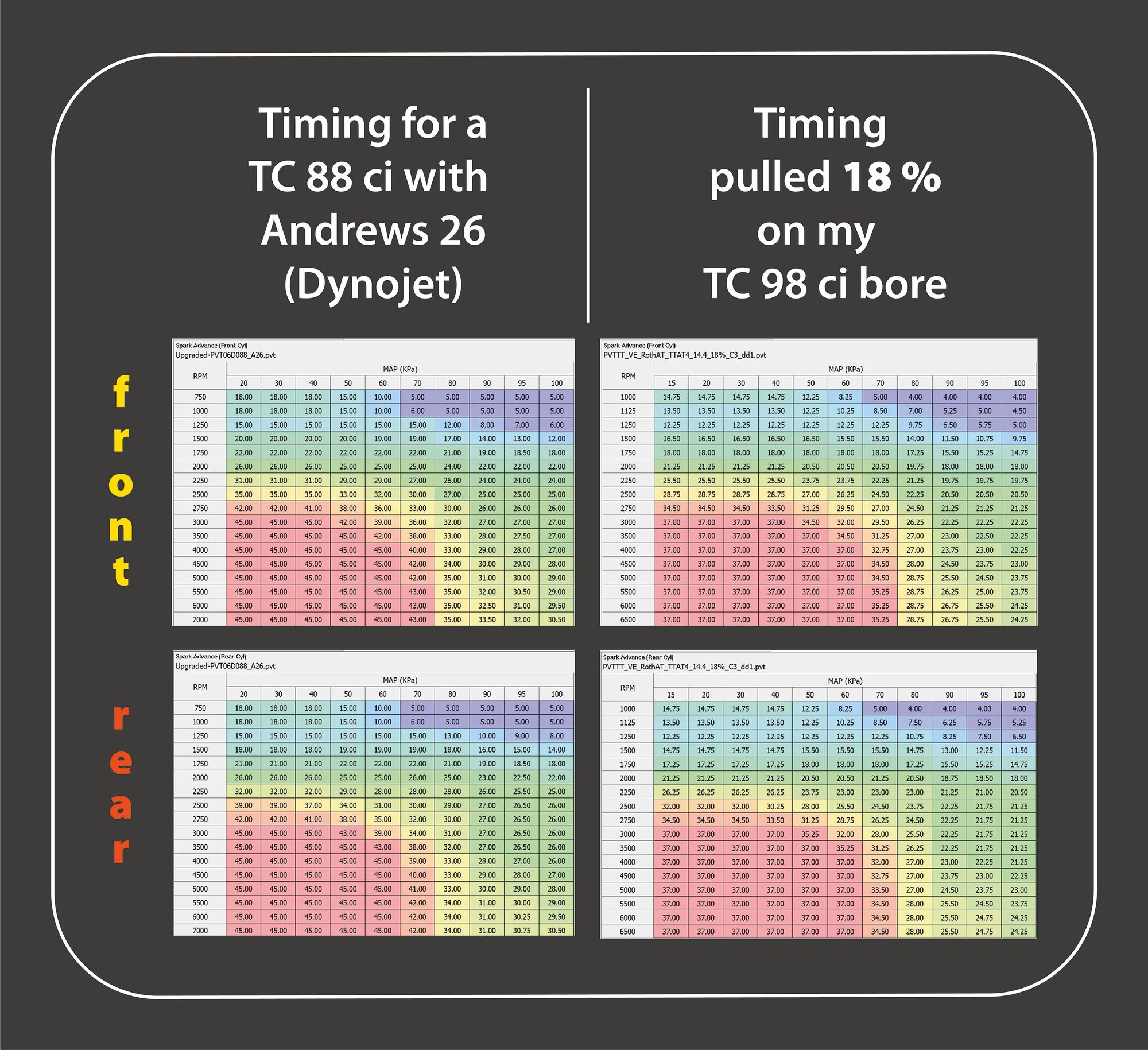 Here are the spark tables I have used. One before the big bore, and one after where timing is pulled 18 %. There are minor differences from a mathematical decrease of 18 %. I think I might have used the smoothing function in WinPV, so it is not exact 18 % everywhere.