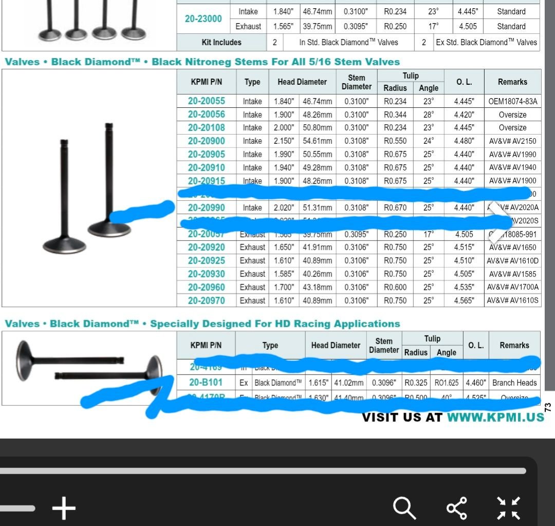 No on the valves.. I specified from the KPMI catalog exactly which valves I need to get the tip protrusion down to where it was manageable.. 2.020" intake and 1.615" exhaust.as indicated in the attached pic. 5/16" stems.. I believe they were shorter in overall length by .090"intake and .075" exhaust. Plus adding the .040" height increase to the rocker shaft when I had Vulcan custom make the rocker mount assembly's, it really helped to correct my rocker geometry not to mention the addition of the S&S roller rockers. So far all works very well and with the older tune in it, it perofrms verry nicely.