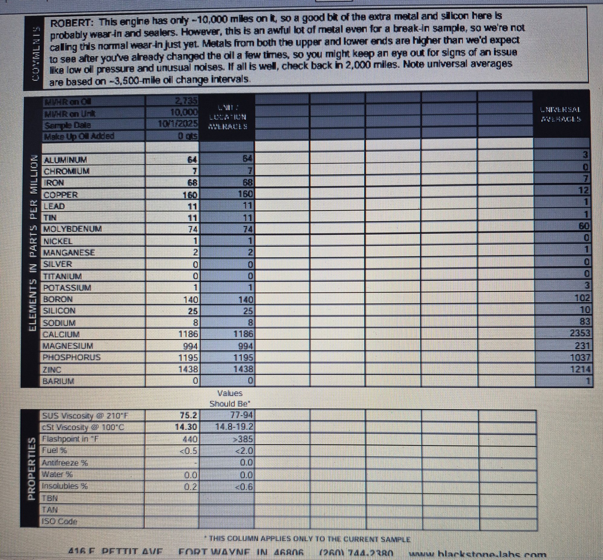 Long way around to get to the point. I was concerned that after the two rebuilds and the damage to the first set of rings/pistons could have resulted in some metal traveling in the oil so I sent a sample to Blackstone. The analysis was complete and based on the analysis Blackstone included their evaluation of the condition of the motor. No metal in the oil, healthy motor that should stay healthy for many more miles.