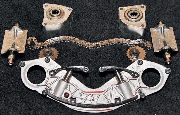 The rwo balance rotors have two hydraulic tensioners and the chain is roller. There is a small screen filter in the cam plate for the system.. Once grooved in, wear ceases.