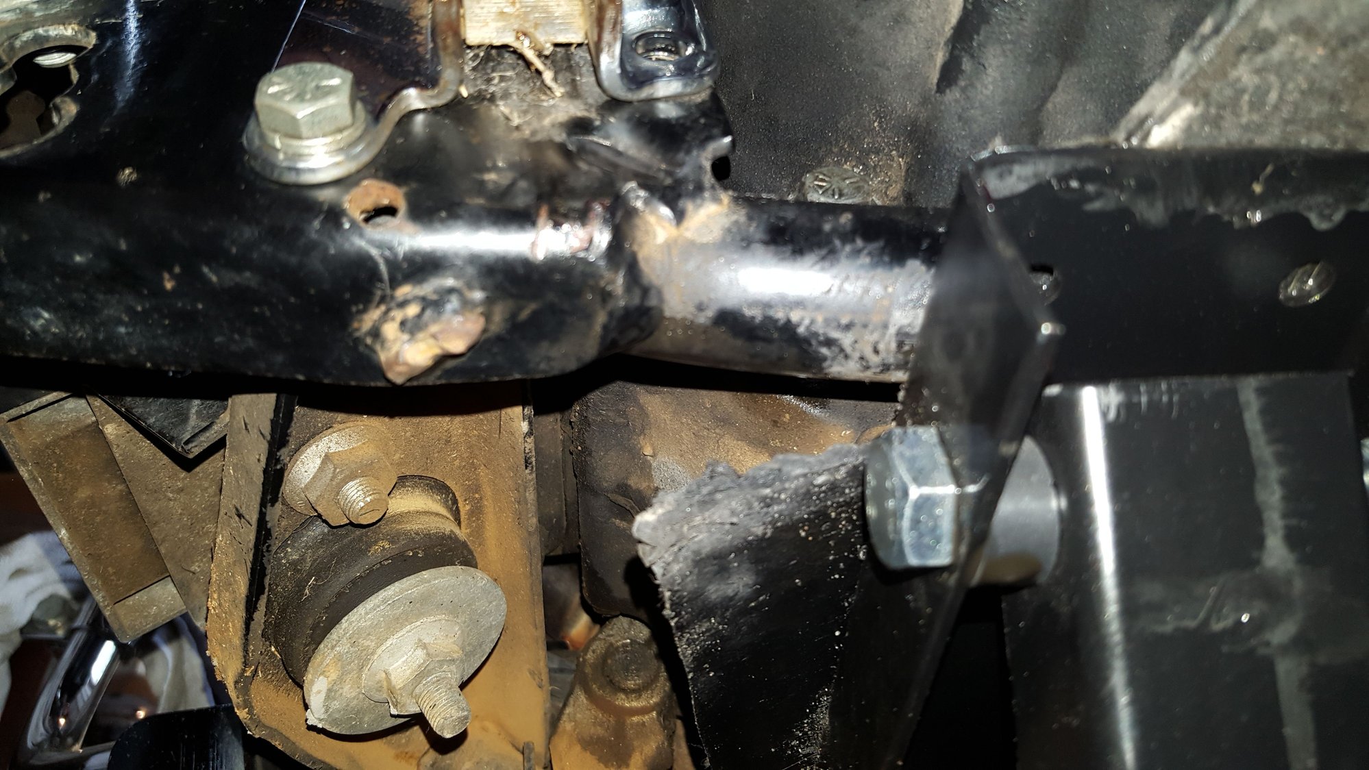 Thanks for the info and ideas. Not sure what I'll do yet, giving it some thought. The area where the jiffy spring mounts is in front of where the frame tube curves up, it's flat bottom angle stock there so easy access behind it. Since its flat and access to both sides is easy, I'm considering grinding the remains of the old mount flat, drilling a hole, and threading a nylock nut 3/4 of the way down a 2" x 14/20 bolt. Insert the bolt through the frame with the head down. Put another nylock nut on the bolt from the backside.