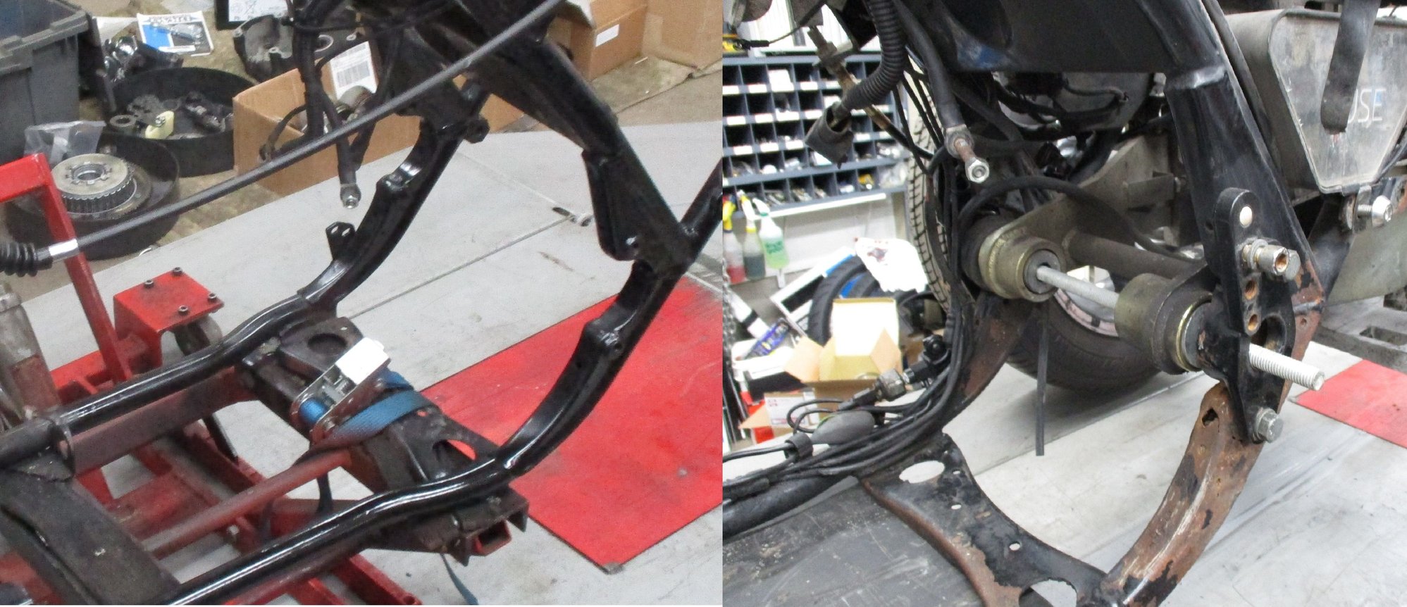 I picked up the partial frame from the craigslist guy in NC. It's not the same as ours but it appears to be identical in the swingarm area. Off to the welder...
