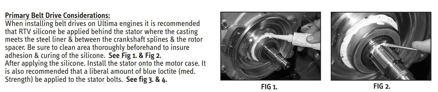 This is the recommendation from Ultima engines for those running a belt primary to ensure a leak free operation. I might put some RTV on the outside of the steel case liner, but would not trust RTV on the splines. RTV could break off and get sucked into the bearing and into the motor and oil passages. That's my worry. Has anyone done this with a belt or wet primary?