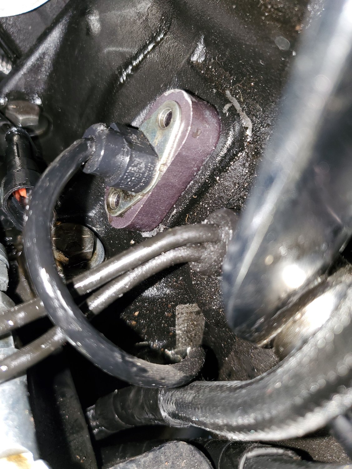 when I was installing the oil cooler I dropped and couldn't find one of the screws that bolts the sensor to the block. I pulled a screw out of my jar I have of extra stuff. The one I used was just a tiny bit longer. I remember when I put it on it screwed right in. Well it was too long and rubbing. Creating the noise.