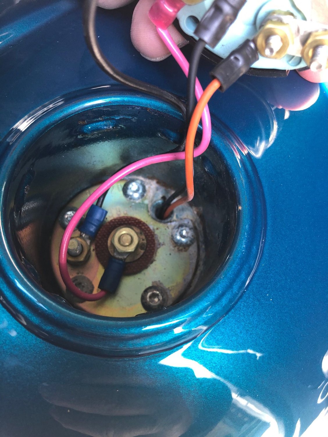 Decided to pull my 1995 Road King out of storage after a 4-5 year break from riding. Unfortunately I did not prepare anything to do with the fuel in the tank and a considerable amount of rust has developed. Before cleaning and relining the shop wants everything removed including the fuel level sensor in the left side cap. I have gotten it to this stage, removed the 5 Torx screws but the assembly won't budge. Am I missing something or does it just need a tap here or there to loosen? In addition, it looks as though the black and orange wires will need to be cut and remove connectors to fit through hole for removal. Any help is appreciated.