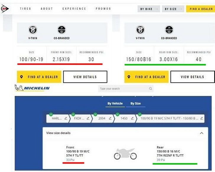 I've underlined the front tires in red and the rear in green, Dunlop in the first panel and Michelin in the second panel. They look like the same size to me.