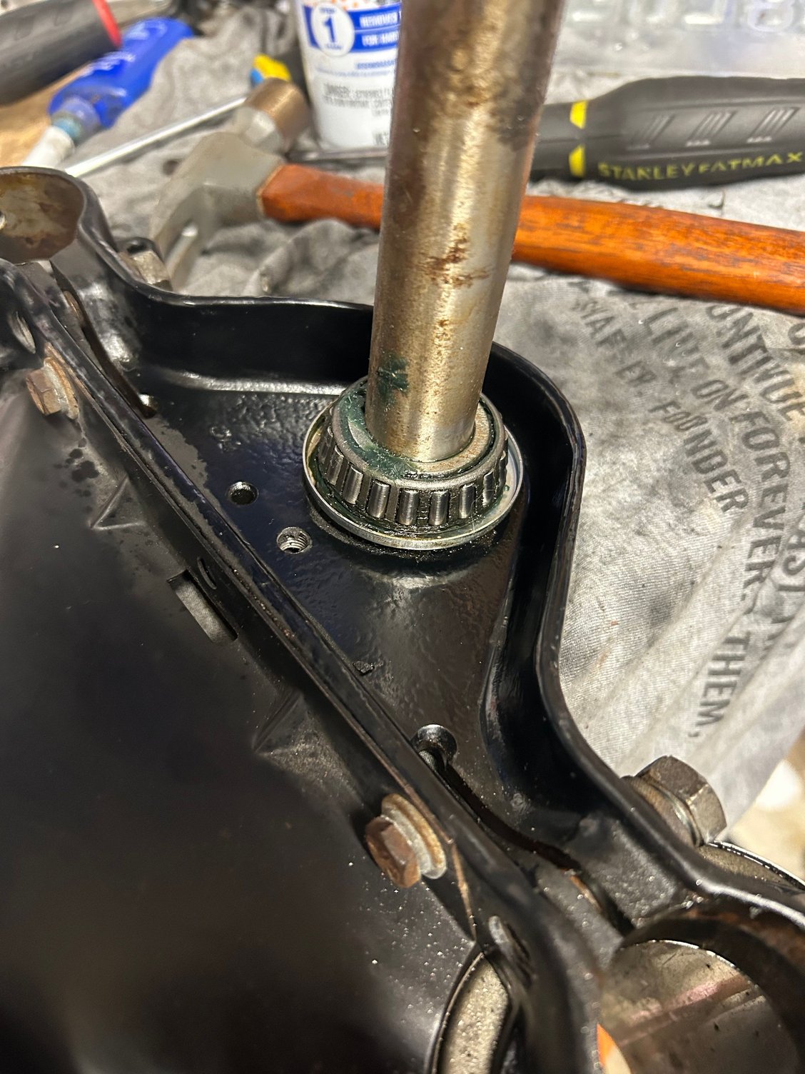 For all of the corroded and rusted in bolts I had to go through to get to the bearings, they look really good. Someone has been here at some point and repacked them. I will obviously repack them now that I am this far in, is there a method to getting the bottom bearing off to repack it? The manual says to chisel it off...