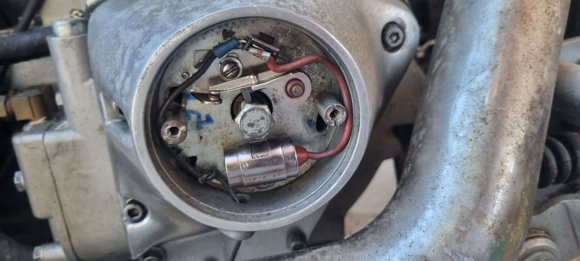 now behind the plate they the points and condenser is bolted to is a mechanical advance unit that rotates back and forth for the engine timing remove it completely and clean it good it has to rotate very smooth and the weights in top with the springs need to be not wiggle loose