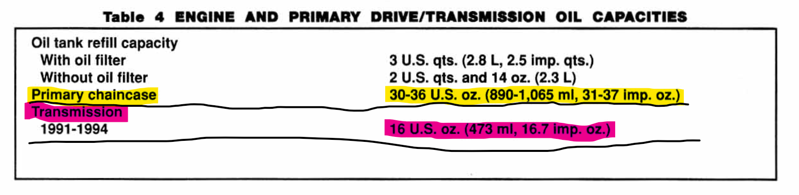 I've got a 'Repair manual' PDF that I found online (actual book will be received around Christmas), and tabel 4 tells me the 'Primary Chaincase Transmission' holds 16 U.S. oz, or 473ml.