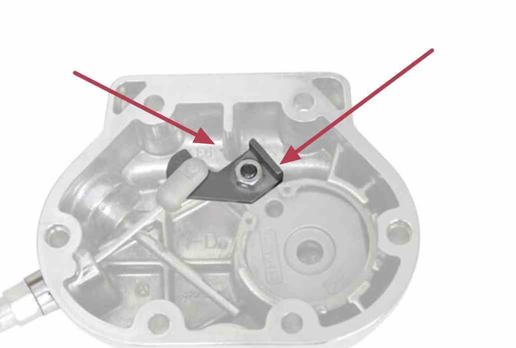 First the spacer needs to be about 1/2 the thickness. This gets you more threads in the tranny cover. Second I install the part and cut the shift fork pin stop until the arm with cable stop rotating clockwise (left arrow) when pressing down on the outer plate and allowing the arm to rotate. Third I check to make sure that the T part of the arm does not drag against the outer cover. (right arrow). Use 1/2 turn on the center adjuster.