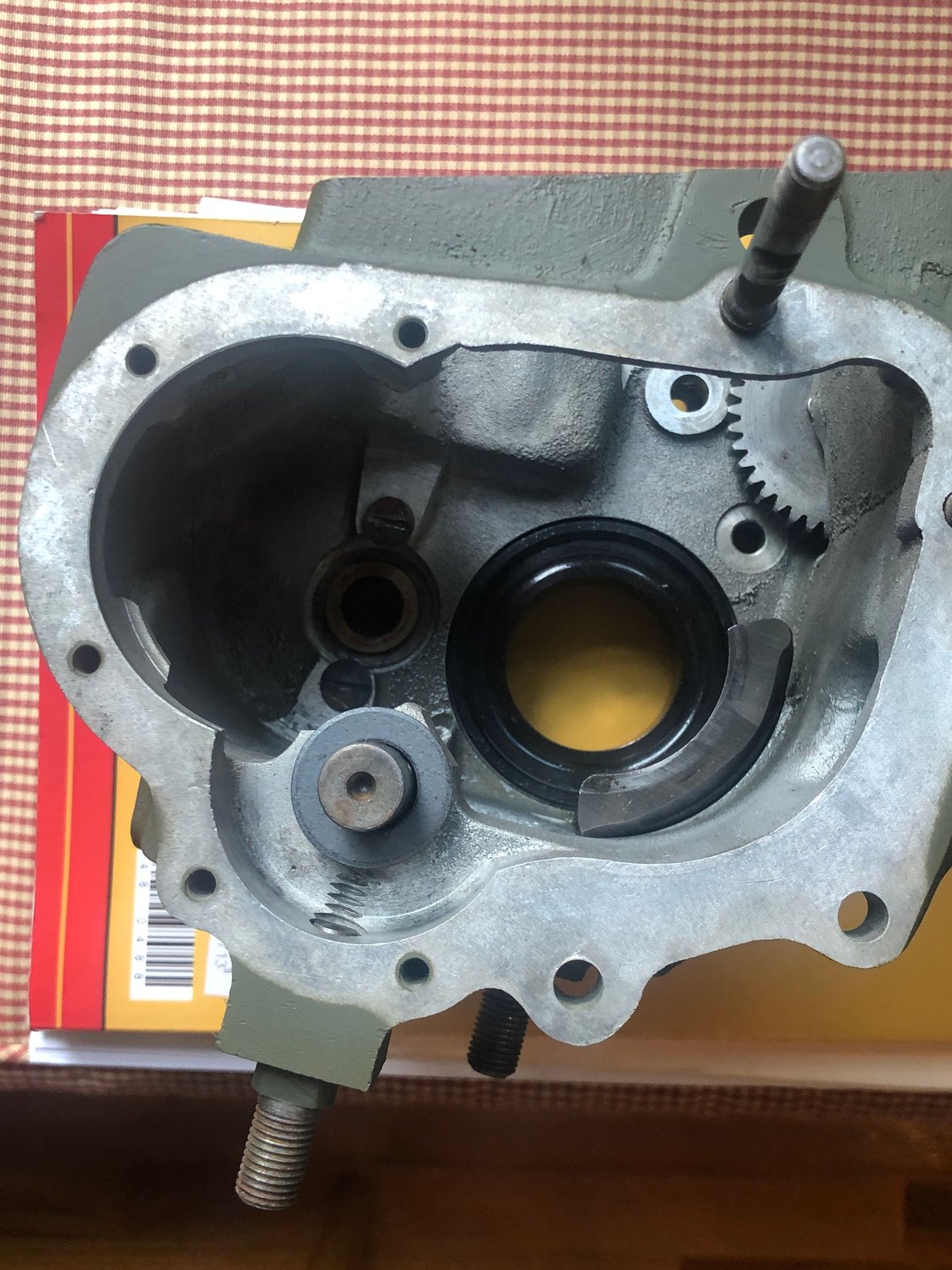 you might want to epoxy the trans studs tops - as they leak through the threads and the slots that align with the frame - 1/2 turn to tighten them is a lot - so we epoxy the tops - then use glyptol to coat the inside of the case - I have also drilled and tapped a 1/8 pipe plug in the trans case you can get to so you can drain and re fill the gear box < just a thought we have an evac pump not every one has one