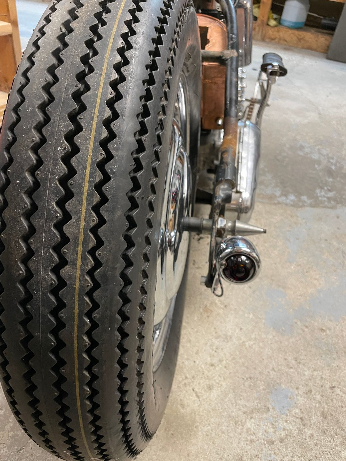 One more detail about the 180 tire. I laced a mid-star hub to a 5" road king classic rim and ran the wide tire on a tubular swing arm / drum brake combo and had to do the drum / wheel install as an assembly.