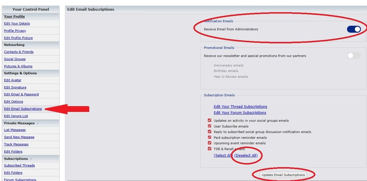 3. At the bottom center, in the 'Subscription Emails' box, click 'Deselect All'