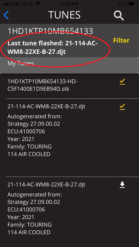 With Dynojet PV4 to verify which tune is currently in your ECM open the Dynojet app on your phone, go to "Tunes" and at the top is displays "Last tune flashed", see screenshot below