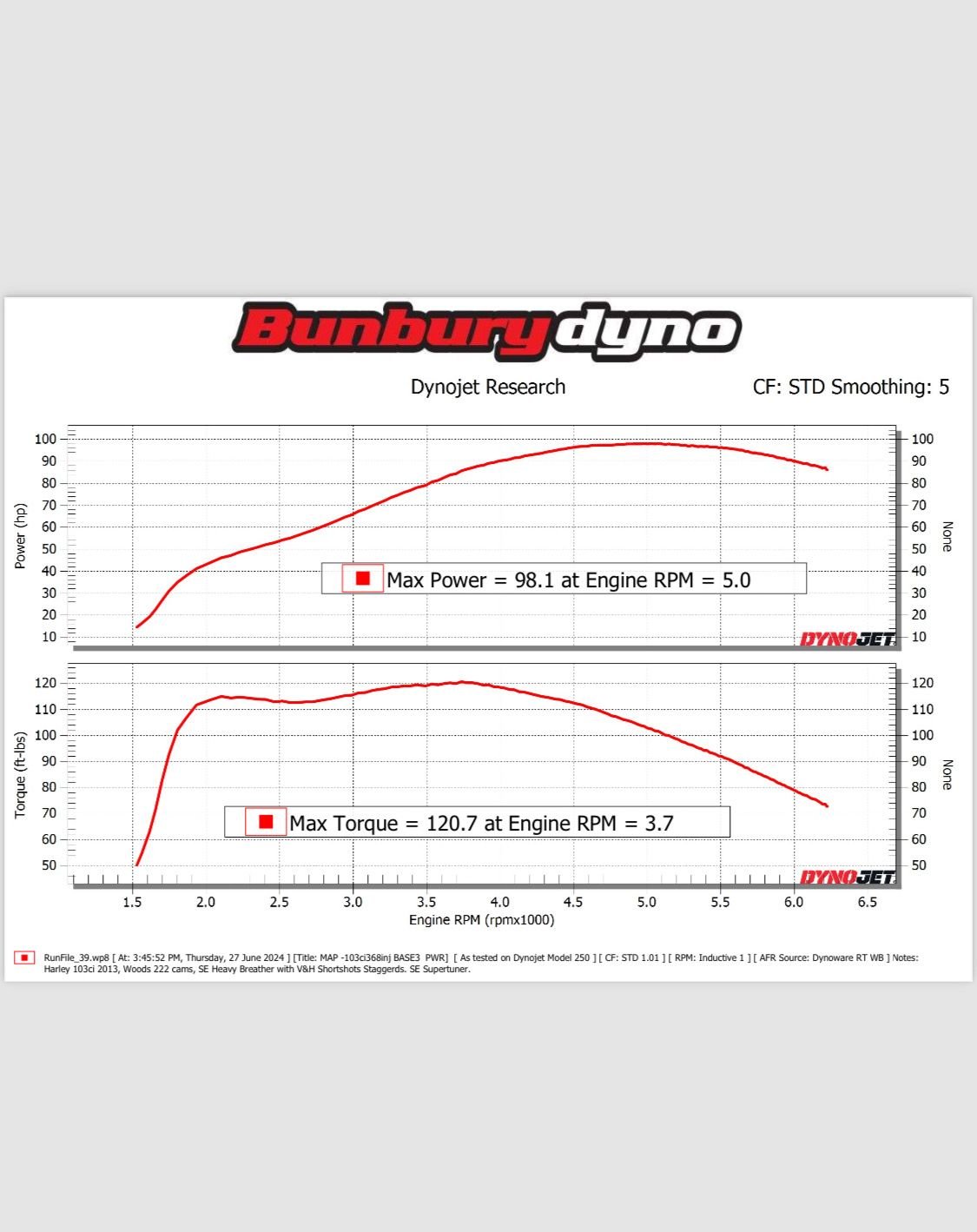 Mike G came up from IL yesterday with his sweet 09 FLH for a cam/exhaust swap. We installed the Wood TW-222 cams, Jackpot 2/1/2 Ceramic head pipe and gave it a full dyno tune with Dynojet Power Vision. This results were awesome, this setup made 94Hp/105Tq, outstanding for an otherwise stock 96" motor! Power is nice and broad. Thanks Mike for giving us the opportunity to add some Fuel Moto power