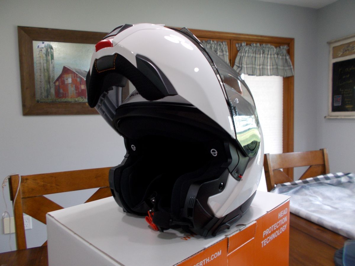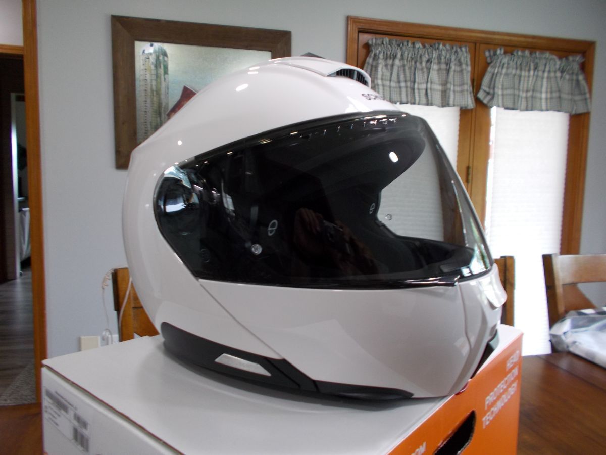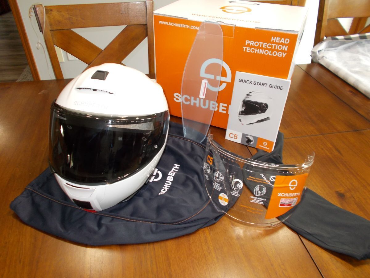 Like New Schuberth C Modular Helmet, Size Large in Brite White. I purchased it new this year and it has never been dropped and has no scratches. It comes with a Clear and dark gray visor, never used pinlock, owners books, helmet bag, extra visor bag and Pre installed Cardo Speakers and Mic.