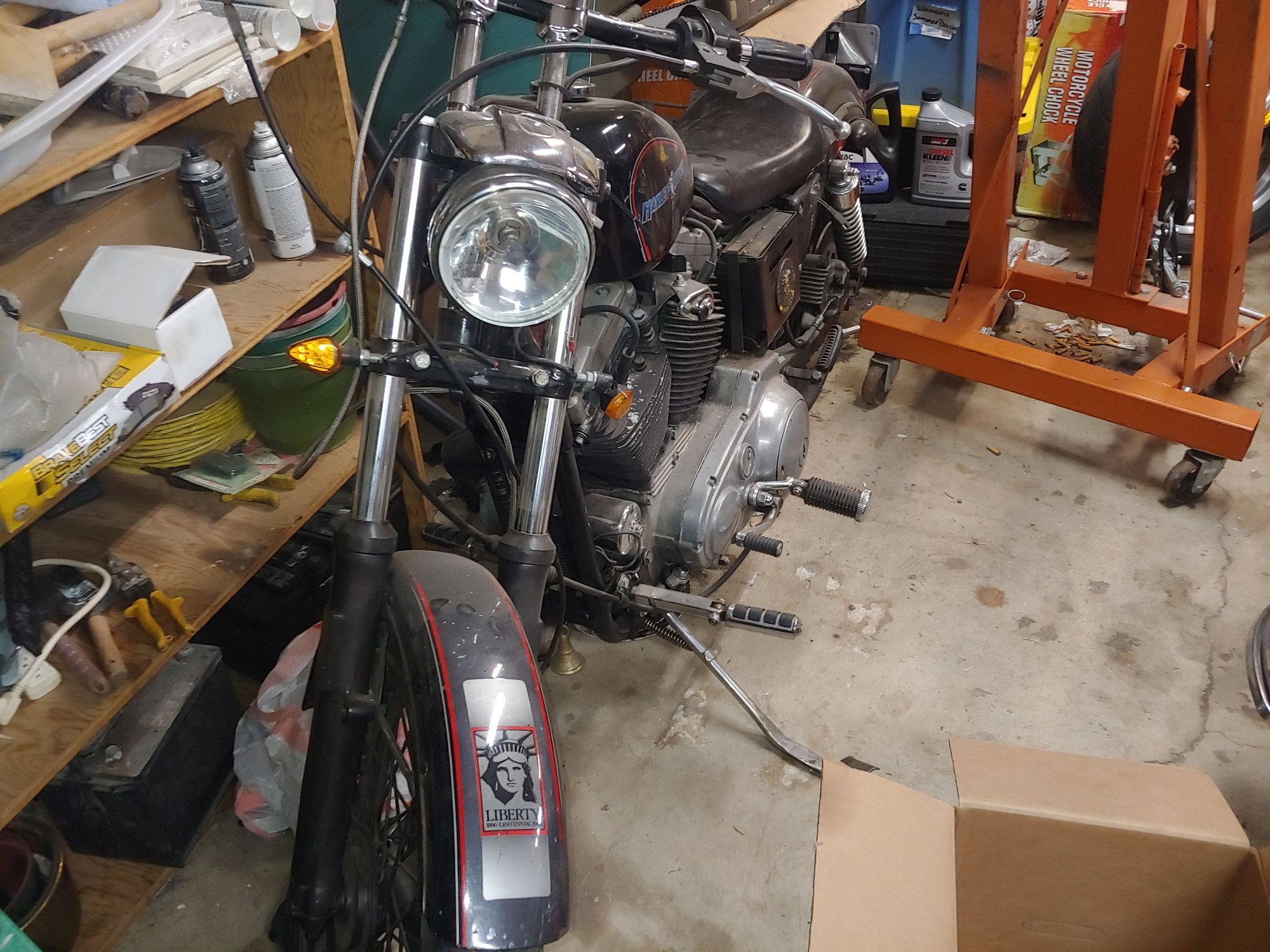 I was able to acquire one of these About 10 years ago. It was supposed to be my wife's first bike. We picked it up from a gal, here in town for $800. It was mostly original. It was missing the original gauges and bars. Had some wear and tear. She decided it was a little too big for her to start out on. So it went in the garage for a while. One thing led to another we needed our house painted. So I traded it for a paint job on the house so we can sell the house. I basically traded it to him for $800 off the paint job which is what I paid for the bike. He was an old friend of mine. Fast forward he ended up going to prison and needed some money so in turn I gave him that $800 back again and received back what was left of the bike. Turns out he had gotten into drugs. So the bike was now missing the original seat and sissy bar. I had also acquired a set of original gauges, original air cleaner cover, and some original turn signals. When I get it back all of that was missing he tried to make it into some kind of a bobber. And rattle can the Chrome and some other parts black. Fast forward a couple more years the bike left me again. It ended up in Florida of all places. With another friend of mine. That friend ended up in a divorce situation after he had moved down there. So he came back to the Northwest with bases with nothing so over the course of a couple months I was able to arrange to get his stuff and the bike back up here and for doing that I got the bike back for free. But now it's in pieces:-( it's a rolling chassis I've got a long road ahead of me and I'm missing parts. If anybody knows where I can get an original seat sissy bar, with the emblems on the back of it Thomas since that was on it when I got it. Also the chrome battery cover with also emblem on it. One mistake I saw in the thread was that it said the exalh1100 came with the 9 spoke aloys. Which is false. I have the original parts catalog for these bikes. Although you could get those wheels if you wanted. The Liberty Edition actually came with aluminum Tru spokes. Which I have on mine although somebody painted those black as well:-( luckily for us we have an excellent Wheelman here in Spokane. Anyways if anybody knows where I can get in touch with somebody who has decals I would appreciate it. Or any other parts like the original Buckhorn handlebars or a set of gauges. I do have the license plate frame. I actually held on to that when I got rid of the bike the first time. But it's going to need a paint job and some body work on the tank and the front fender and I don't know if I can save the decals that are on it or not. It will never leave my side again it came back to me three times. For some reason it has tagged me as the one it should be with. And it was a lucky thing I got it back this time too cuz that guy was going to cut the fenders up and make it bobber out of it. I guess the younger generation just doesn't appreciate nostalgia. I'm sure there can't be very many of these left on the road. The top picture is from about 2 years ago. Before it left and went to Florida. The other two are how it is now. Luckily I drive for a trucking company he was able to get it from Florida back up to Washington State, at no cost to me. I guess I shouldn't say no cost. Cuz it's going to take a lot to get that thing back on the road. I would appreciate any advice and tips.