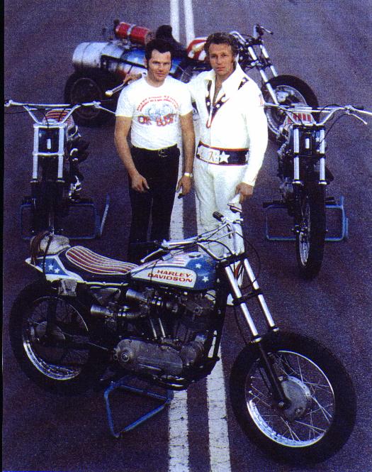 Evel used Honds's at first, then Trumps early in his career. He also used one the first time on ABC/Wild World of Sports. He later used American Eagles, which he described as "junk." Evel, although my childhood hero and I have met several times was his "Own Man." He rode what was free. He did not become as famous until he signed with Harley, things took off from there. I am named after Roger Reiman who was the 1964 Grand National Champion and Three Time Daytona 200 Winner. He was killed at Daytona during practice for a BMW Battle of Legends race. He and his father Hank owned a Harley-Davidson dealership in Kewanee, Il (Reiman Harley-Davidson). It is now owned by Dennis Packee who was a lifelong friend of Roger's. Roger built Evel's Harley's for most of his career. I have several childhood stories and memories. The Number 1 logo was just designed by Willie G after Mert Lawill's regaining the Grand National Championship in 1969. the first time it was released was in dealer advertisements in May 1970. It was coincidence that the logo had nothing to do with Evel, but he used it to his advantage and made it famous. I have the History of that logo at home. When I get there I will give everyone the lowdown on what it stood for. I was more than 7 stars and 5 stripes.