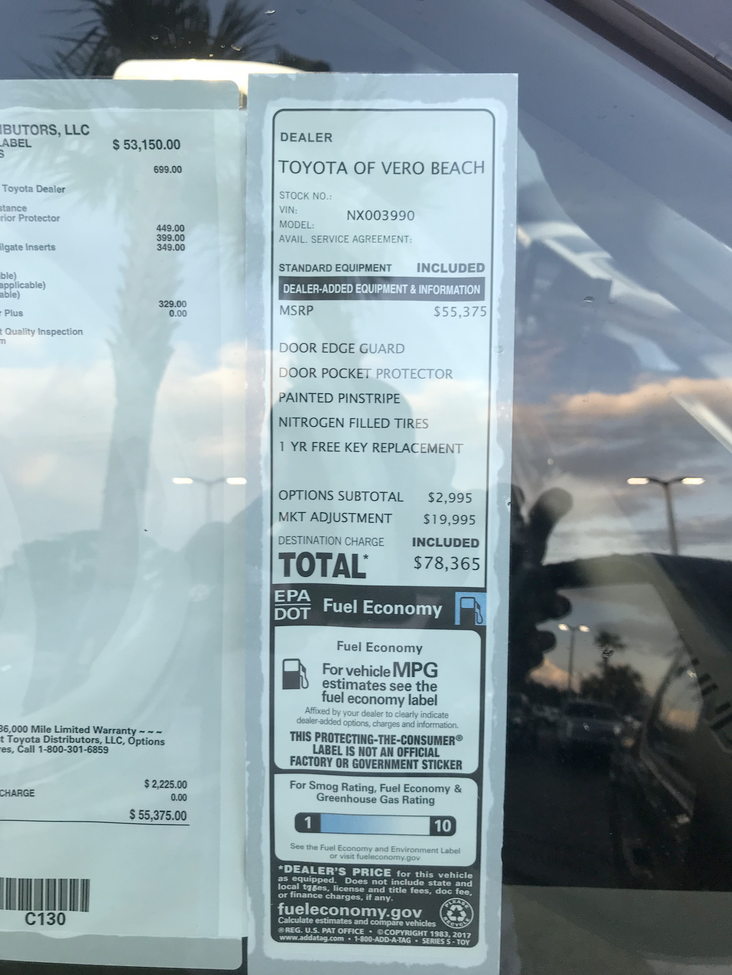 EXACTLY..I posted this a few days ago. This was up in Vero Bch. As soon as we saw all these vehicles were GOUGED (that sure isnt a fair mkt increase , or not to me at least) went down to PB cnty dealer had the same exact vehicles and no mkt value added. In a few weeks I'd imagine that they may change their tune. Most everyone with common sense were laughing and making a B line for the next dealership that had some integrity...even a little would be welcomed vs this group of thieves. $20K thats obscene..... AMF... !!