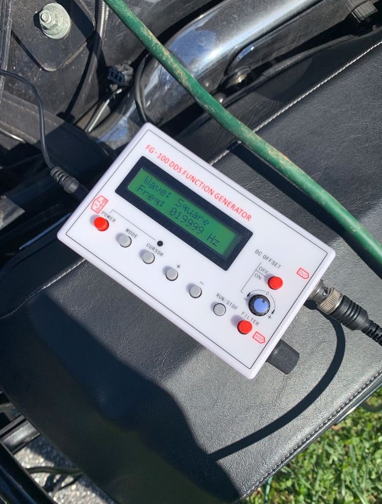 Set the signal generator to square wave, and set the frequency to 22,800 Hz (any higher and my gauge started resetting). Put your ignition to the "ON" and "Run" position. Start your signal generator. You will add mileage to your bike at around 900 mph. I was able to run the generator at 22,800, but no higher than that; photo shows one of my tests at 19,999 Hz