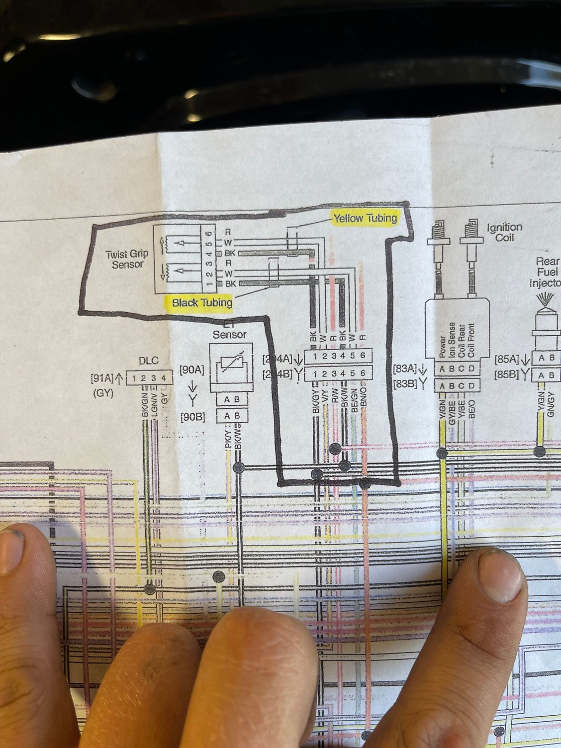 Just put 14” bars on a 2013 street glide. With the throttle by wire plugged in the bike is hard starting, when it does started it bounces off the rev limiter. If I unplug it, it starts and idles fine. Looking at the wiring diagram I don’t see any wires in the wrong spot. What am I missing?