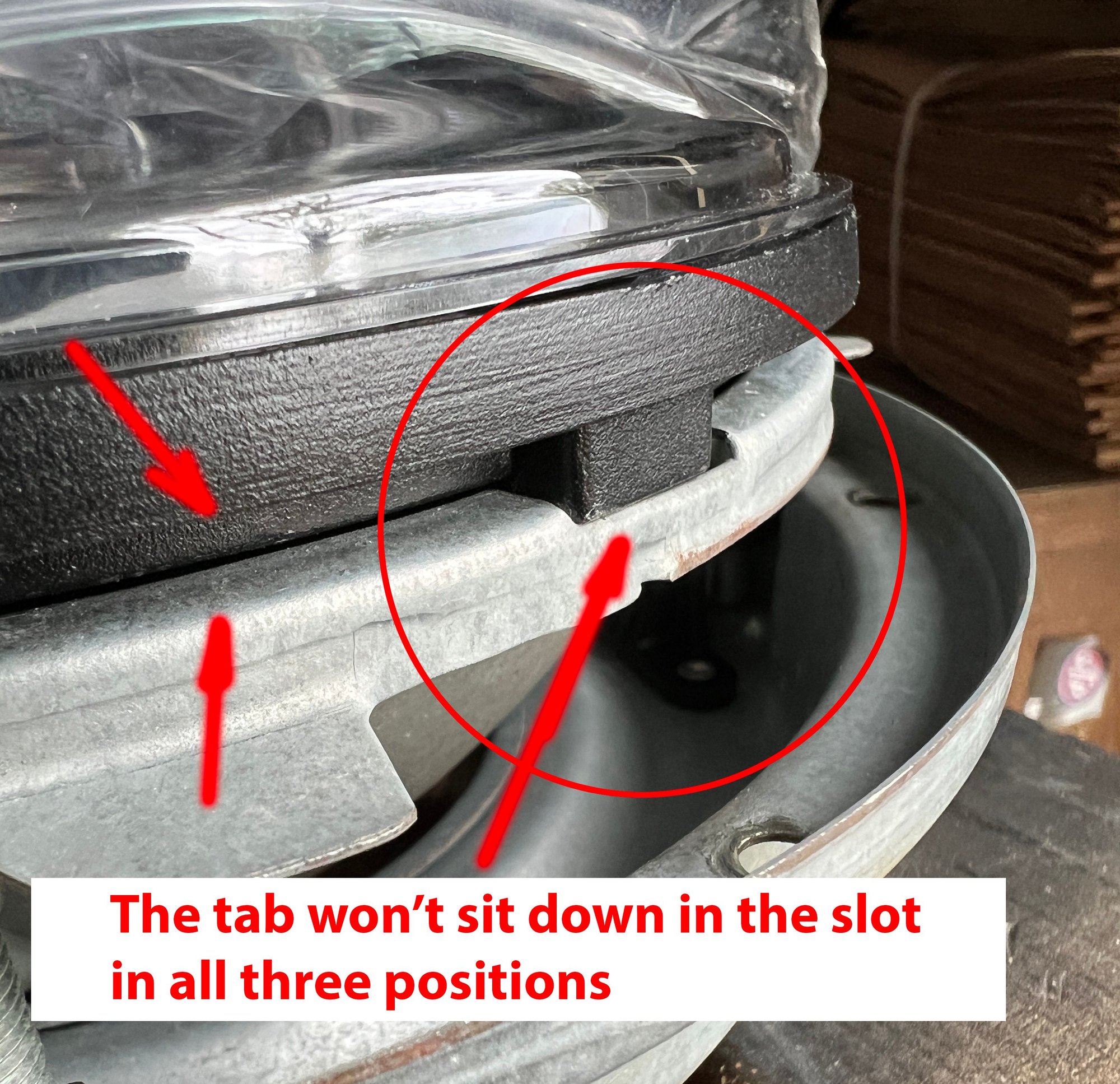 Not sure if you can tell from the pics or not, but the tabs kept the light sticking out too far so to make it work I would have to grind off some of those three tabs. I've spent hours trying to make this light work and I'm frustrated so just decided to send it back. The price was good and it got good reviews from others but I hate having to hack up new equipment to make it work.