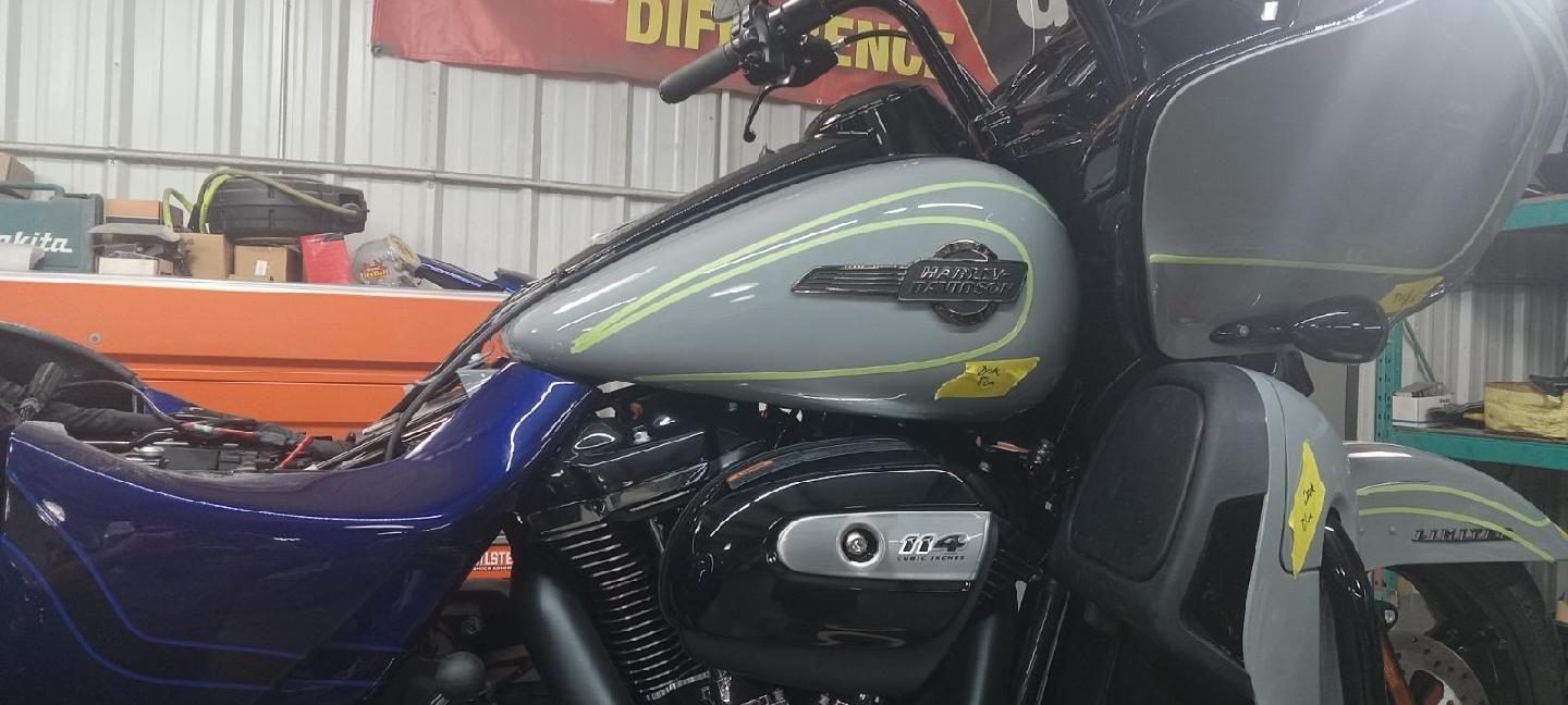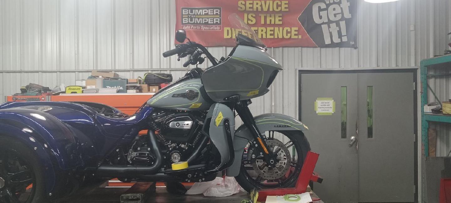 The 2024 RGL and the trike kit are sitting at Hannigan's. Wife,Payton and I decided Zephyr Blue was the color to go with. Hannigan is going to paint the bike to match the Trike kit.