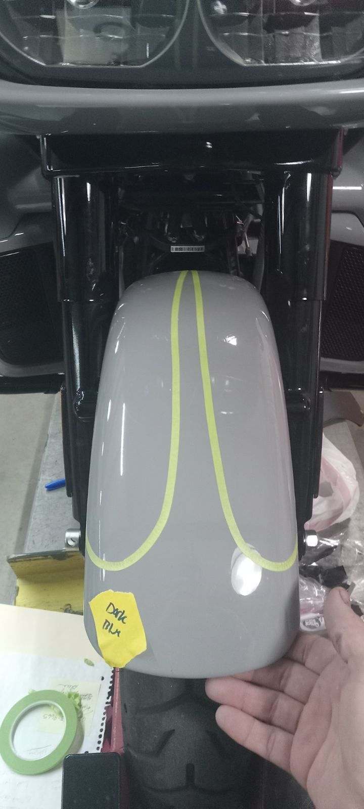 Hannigan got started on it a little quicker. Coming along. Bike is being taped to come up with paint ideas. Pretty sure he has want I want taped out now.