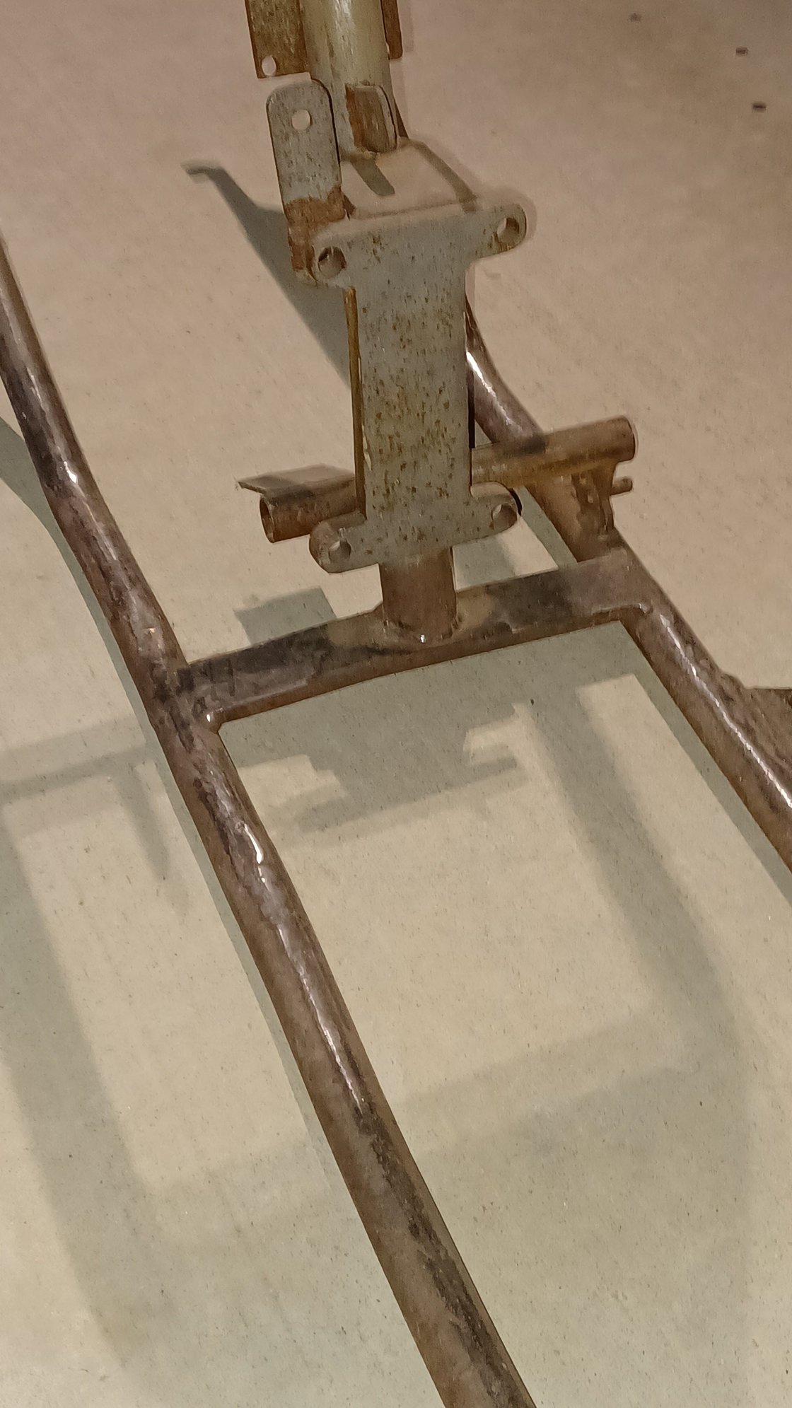 Additionally, the top of my seat mount bracket has been sawed off. I need to refabricate it. If someone has a 75' or so frame with the type of bracket shown in the second picture, I sure would appreciate center to center hole dimensions from the top to the bottom hole, top hole diameter, and spacing between the two vertical tabs that the seat pin goes in on top.