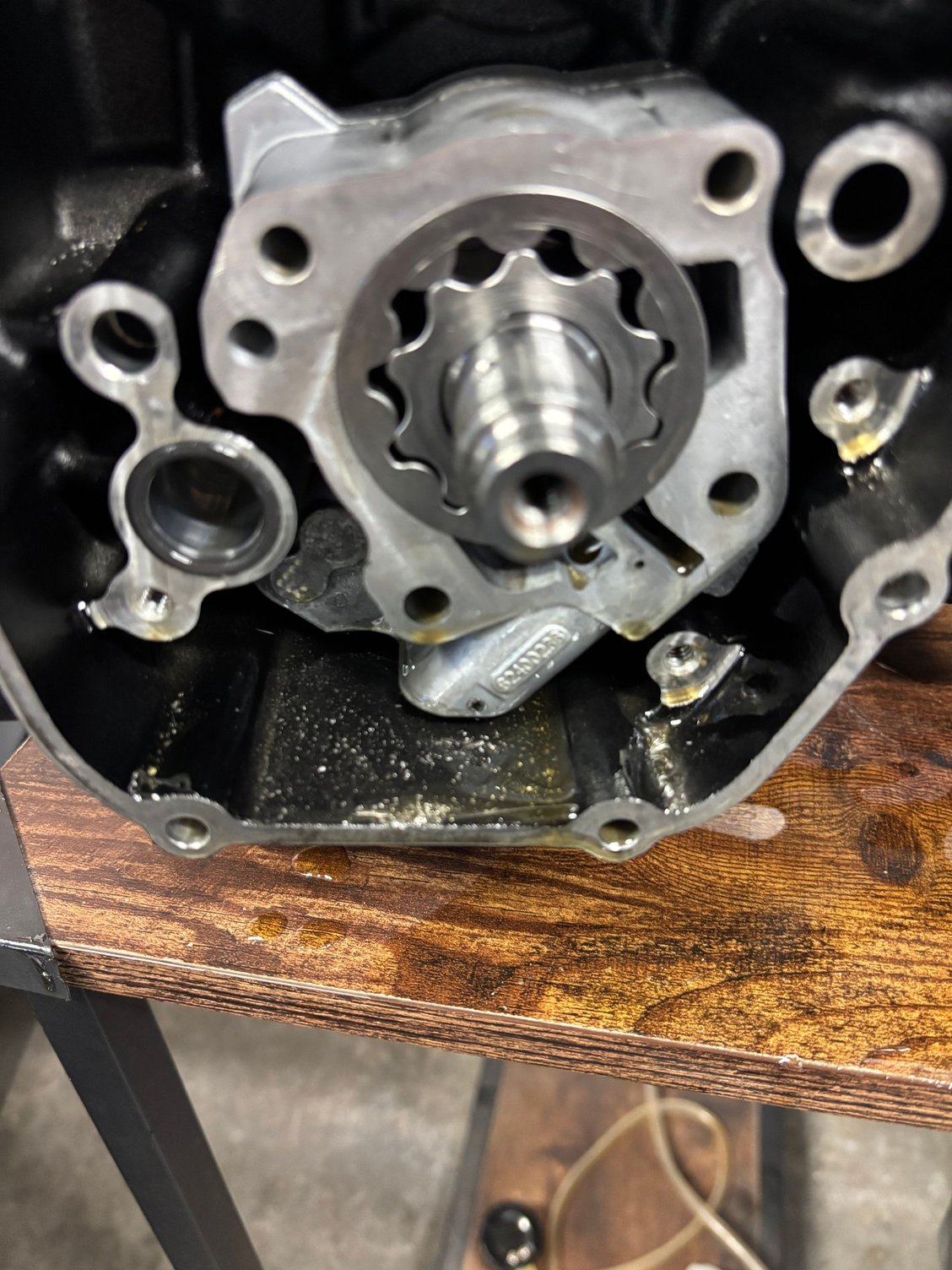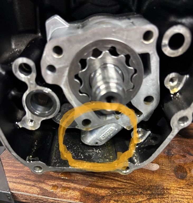 It appears that he didn't put the oil pickup on the pump in the pickup passage on the case, if the pump is in the same position it was when you opened the case. I have circled the pickup on the pump in the picture below. It should be in the bigger hole to the left with the O-ring in it.