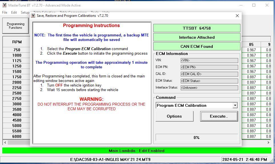 Under "Programming Functions" select program ecm. Should see a window like the attached pic pop up and in the Command window select "Program ECM Calibration" and then hit Execute.