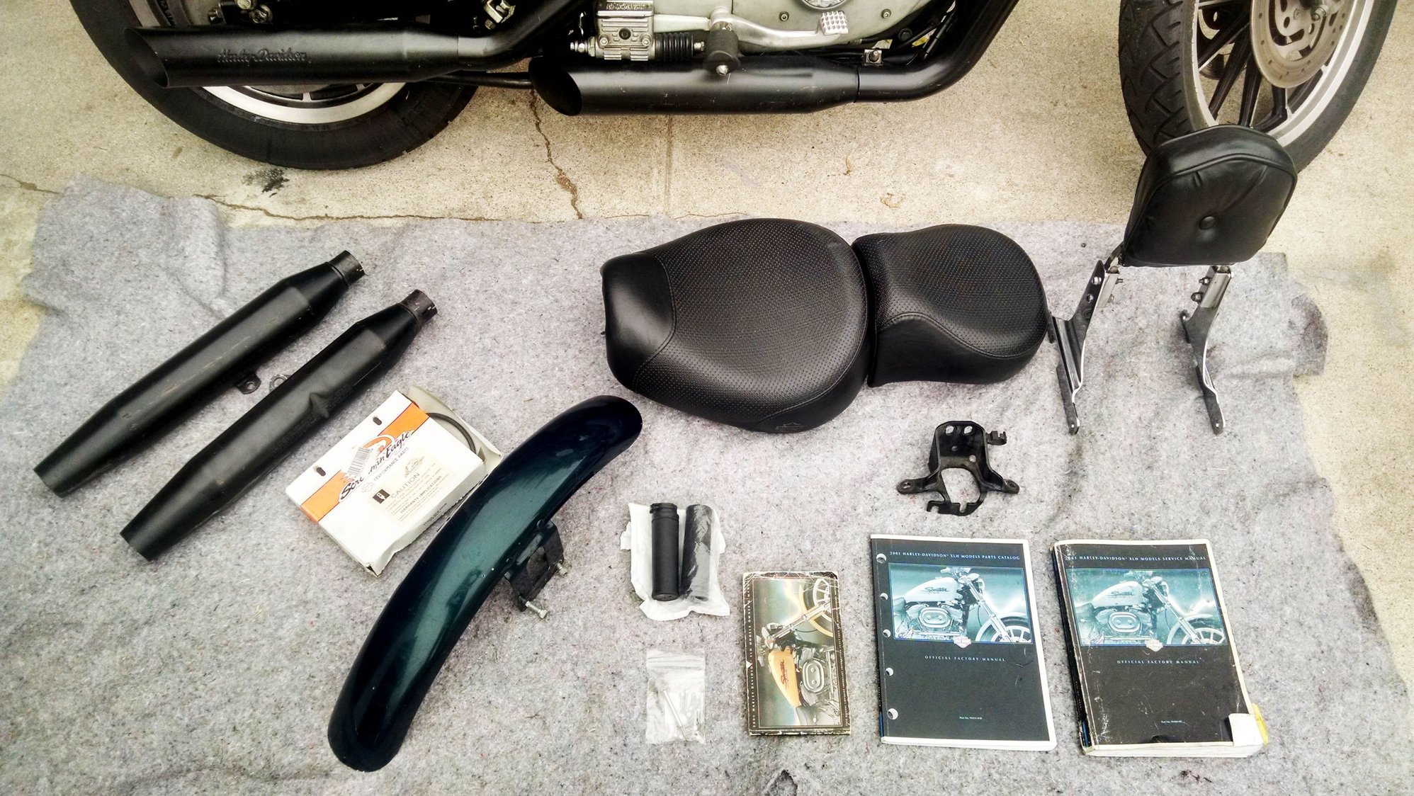 -2 sets of pipes: quiet baffled (stock), LOUD slash cut pipes (takes ten minutes to swap them out)