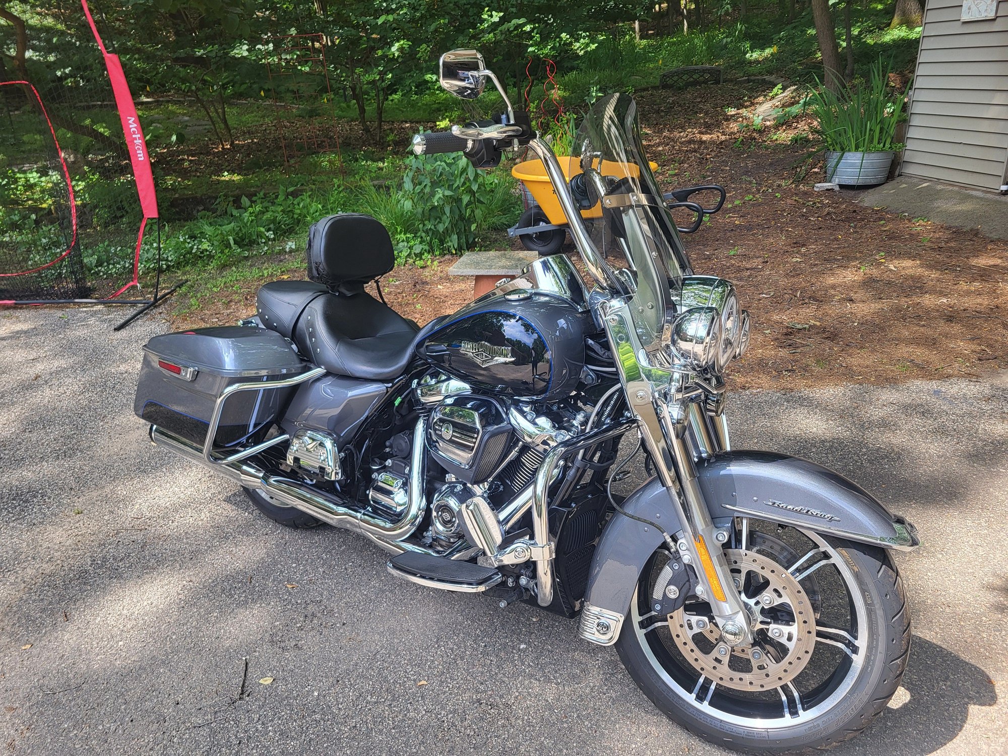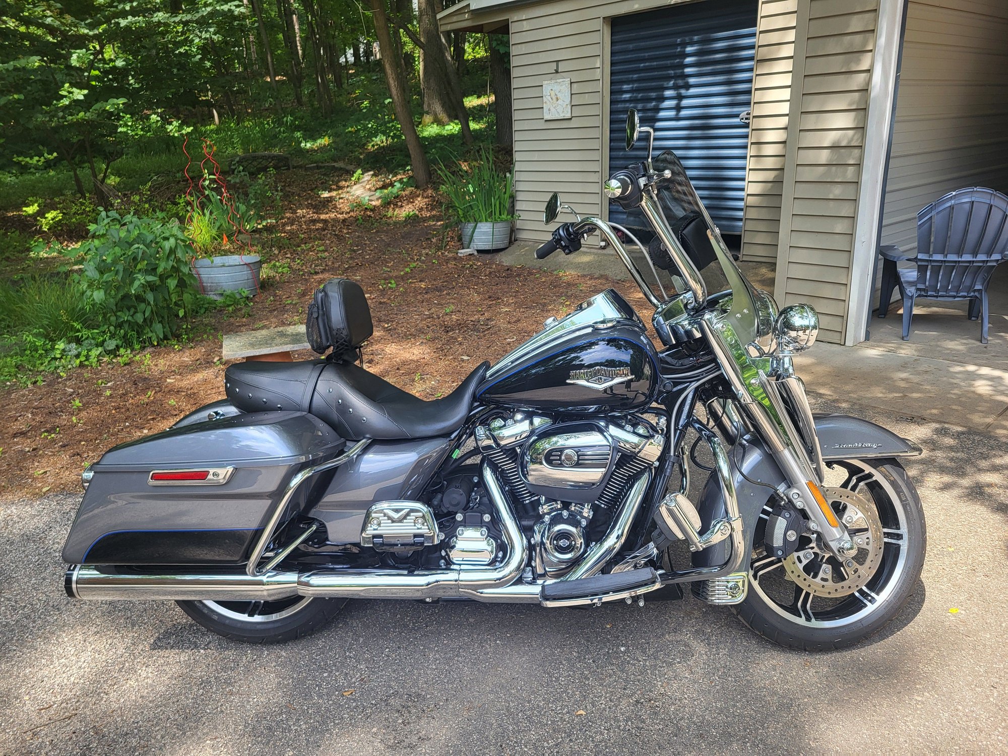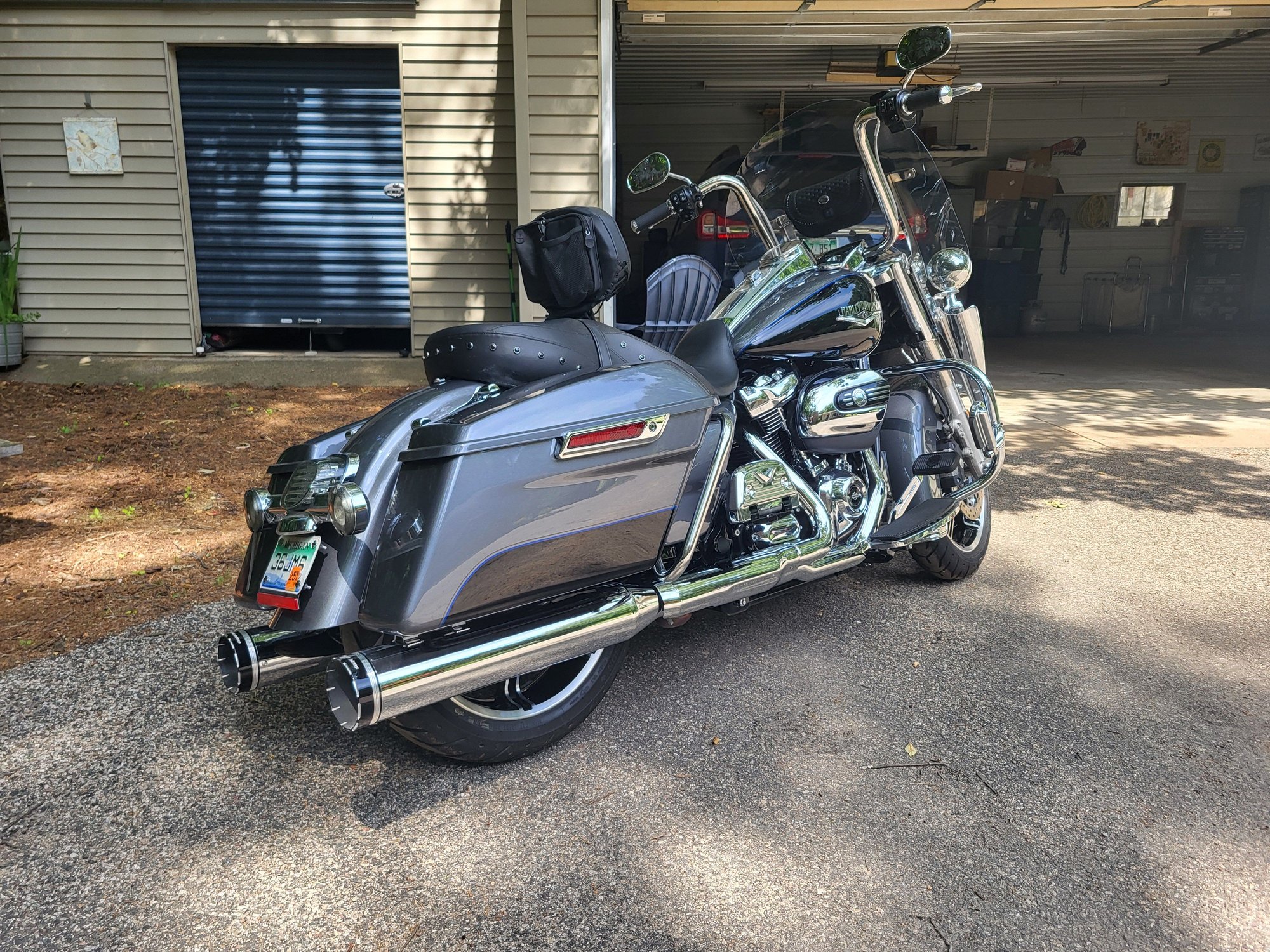 Road King. It is in perfect condition with only about 3,000 miles on it and some time left on the warranty. Engine is untouched; haven't even added the Stage One AC that I will have for sale separately. The following accessories have been added: LED lights all the way around with Custom Dynamics product, including Run-Brake-Turn module; 14" KST Straight Jacket Apes with braided cables; Avon Grips; Boss Bags Windshield Bag; Klock Werks windshield with HD "Fangs"; Rider and Passenger Backrests; Luggage Rack; Khrome Werks Slip ons with louvered baffles; +1 Extended Rear Brake Lever; Highway Boards (HD); Chrome Passenger Board Covers.