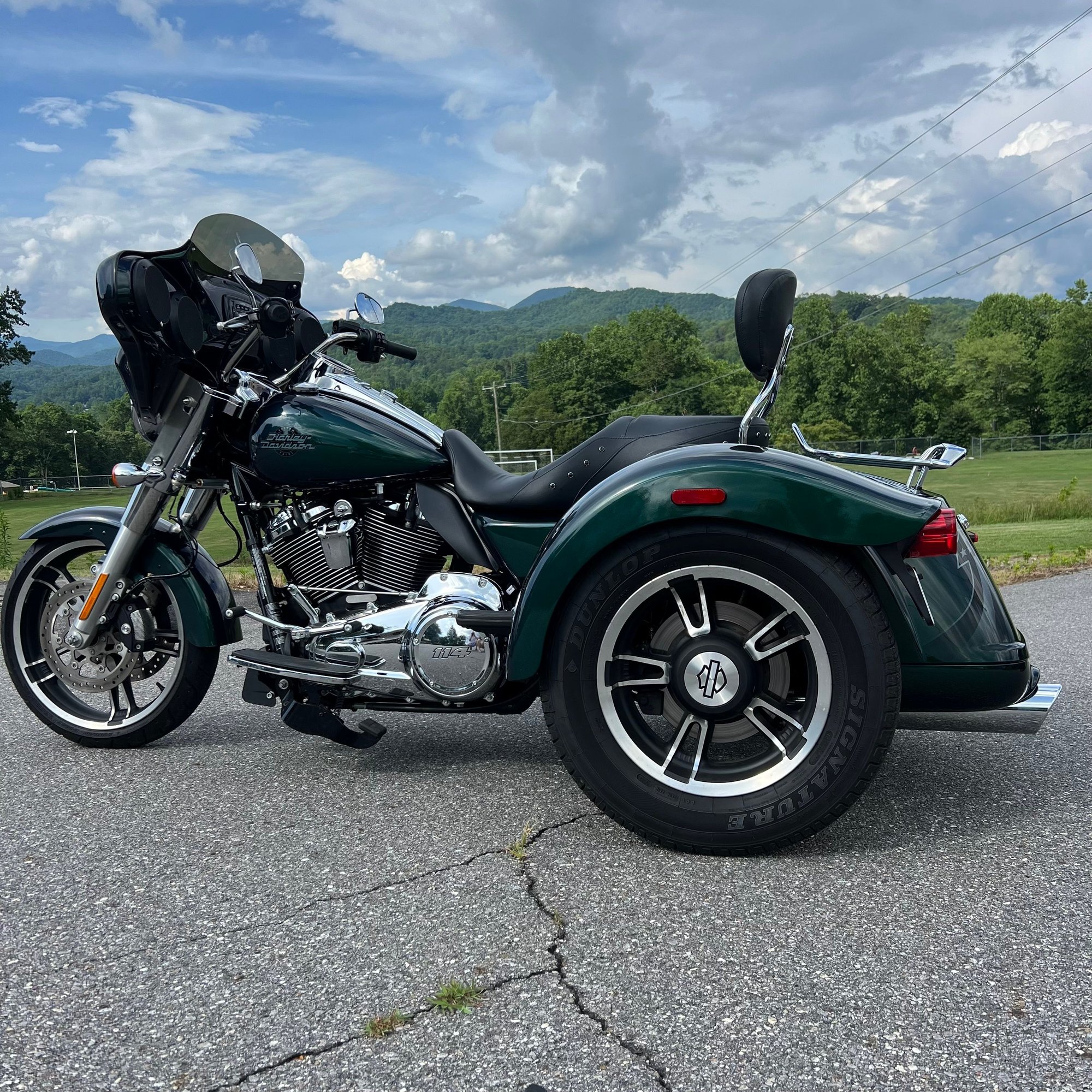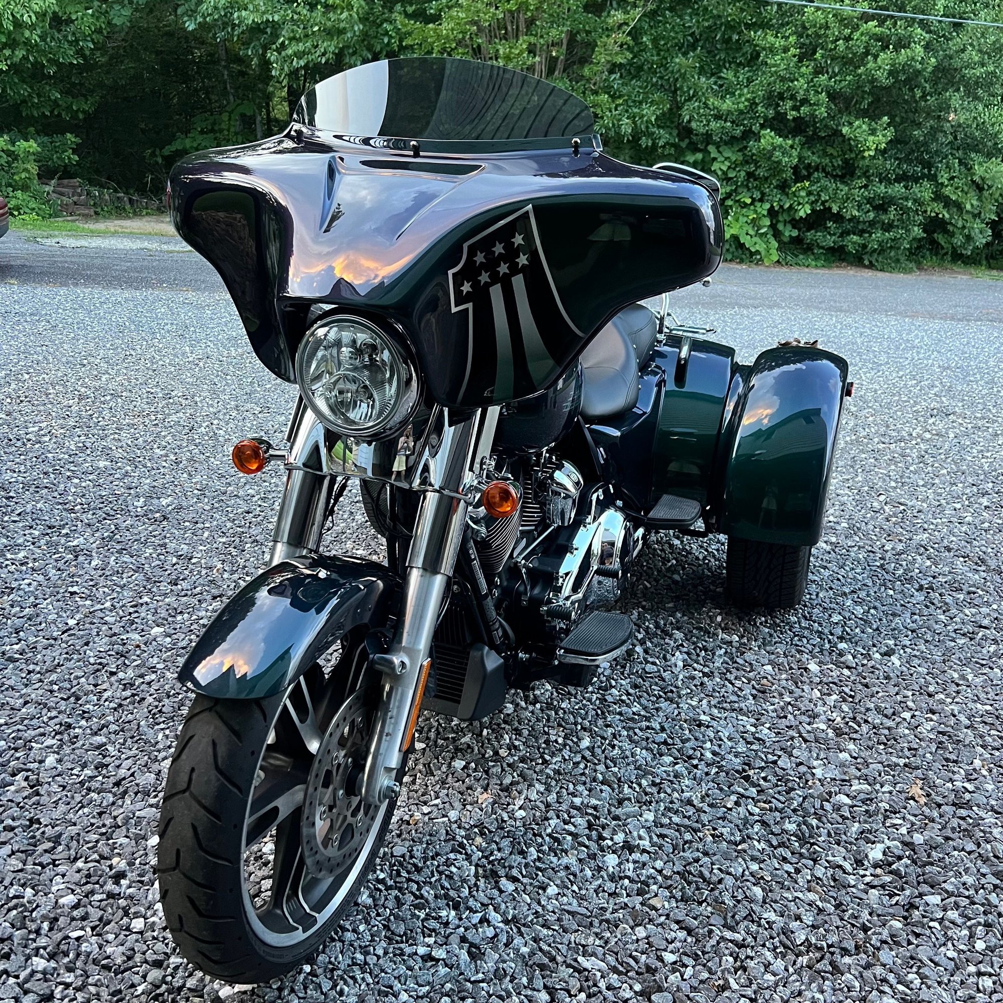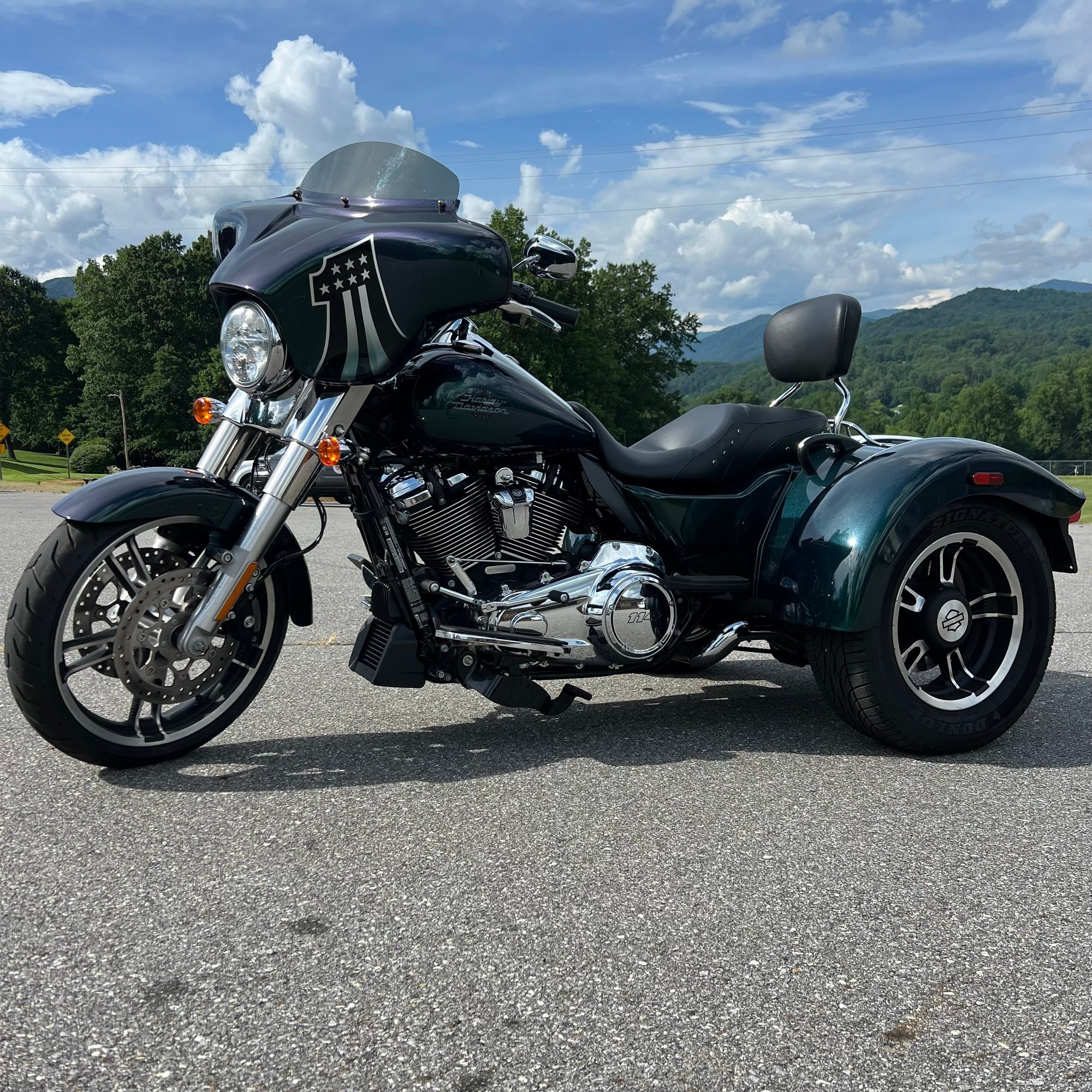 Price is $22,700. Located near Asheville, NC. Harley Davidson Freewheeler 114ci in custom chameleon Snake Venom paint. Snake Venom changes its color from deep green to black to purple depending on the light. It is a very rare paint on the Freewheleer and was an expensive upgrade. Upgrades are all dealer installed fairing dealer painted in Snake Venom, Infinity 4-speaker stereo with 500W amplifier, H-D upgraded seat, integrated LED lighting, H-D cargo rack, H-D passenger backrest, USB charging ports.