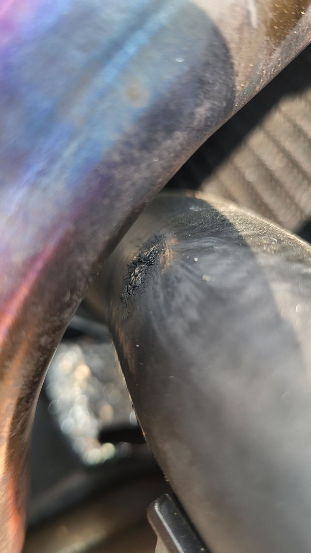 Anyway, while cleaning it I noticed a spot on the radiator hose near the front head pipe. I rubbed the spot, gooey rubber came off on my finger. The hose is melting from being too close to the header pipe (sad trombone sounds), but I caught it before it blew. I called the dealer, sent them pics (1 of which is below), & they said they'll come and get it again & fix it. The dealer is totally apologetic & I'm waiting for service to set a up a time for tomorrow to come and pic it up again.