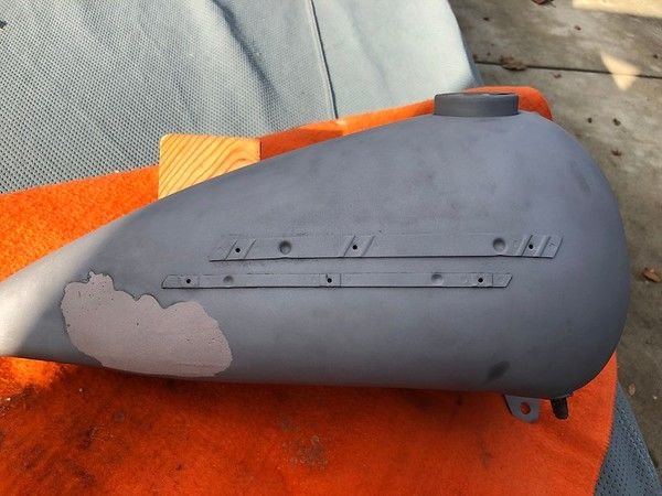 I had always assumed that they were for foot shift model. Had my powdercoat guy strip the paint off and after removing the bondo on the left tank with a propane torch, putty knife and stainless steel brush, I found this...