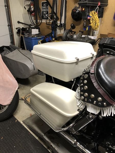 Going to be disassmebling the hardware so that I can have the outside painted (that is unless, of course someone wants to buy me the beautiful 1976 Shovel that is for sale on the fourm and I will gladly attach it to that bike). Going to attempt to remove the sticker on the lid as well (or find a replacement if the attempt fails. I think it is # #53311-69, Name plate "Tour-Pak"). And going to see if I can locate a key for the lock on the lid.